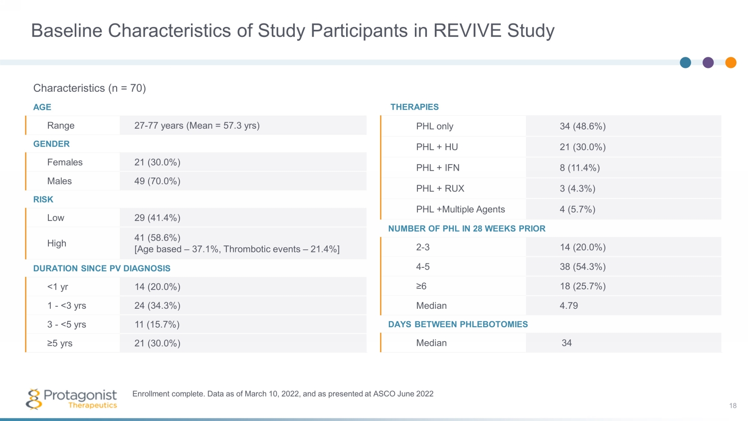 Baseline Characteristics of Study Participants in REVIVE Study Characteristics (n = 70) AGE Range 27 - 77 years (Mean = 57.3 yrs ) GENDER Females 21 (30.0%) Males 49 (70.0%) RISK Low 29 (41.4%) High 41 (58.6%) [Age based – 37.1%, Thrombotic events – 21.4%] DURATION SINCE PV DIAGNOSIS <1 yr 14 (20.0%) 1 - <3 yrs 24 (34.3%) 3 - <5 yrs 11 (15.7%) ≥5 yrs 21 (30.0%) Enrollment complete. Data as of March 10, 2022, and as presented at ASCO June 2022 THERAPIES PHL only 34 (48.6%) PHL + HU 21 (30.0%) PHL + IFN 8 (11.4%) PHL + RUX 3 (4.3%) PHL +Multiple Agents 4 (5.7%) NUMBER OF PHL IN 28 WEEKS PRIOR 2 - 3 14 (20.0%) 4 - 5 38 (54.3%) ≥6 18 (25.7%) Median 4.79 DAYS BETWEEN PHLEBOTOMIES Median 34 18