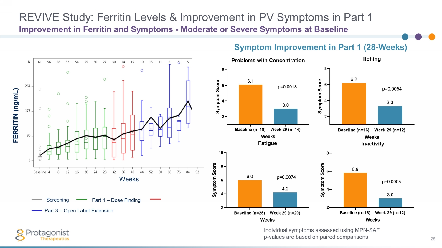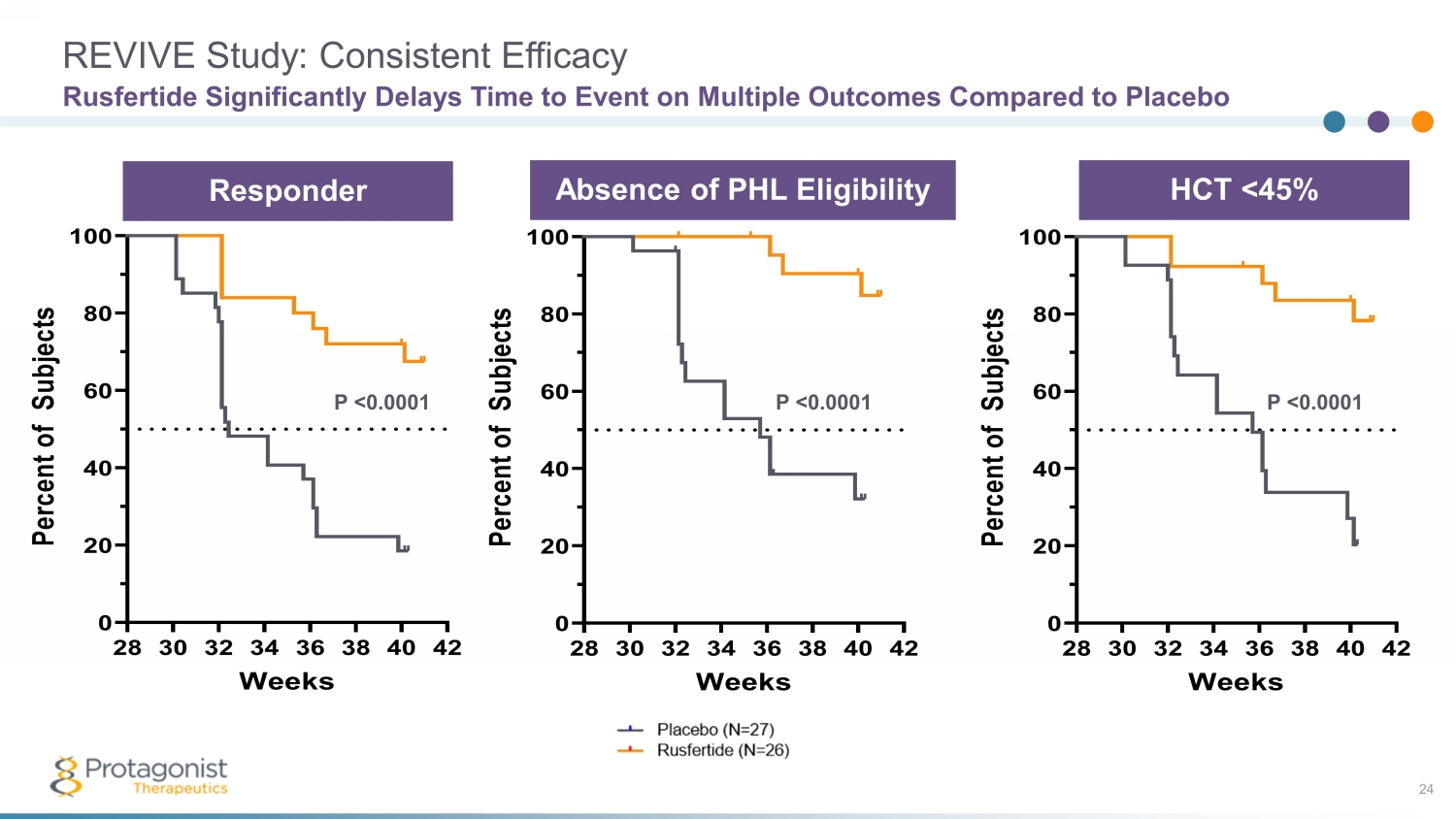REVIVE Study: Consistent Efficacy 24 Rusfertide Significantly Delays Time to Event on Multiple Outcomes Compared to Placebo 28 30 32 34 36 38 40 42 0 20 40 60 80 100 Responder Weeks P e r c e n t o f S u b j e c t s P <0.0001 P <0.0001 28 30 32 34 36 38 40 42 0 20 40 60 80 100 Absence of PHL Eligibility Weeks P e r c e n t o f S u b j e c t s P <0.0001 Responder Absence of PHL Eligibility HCT <45%
