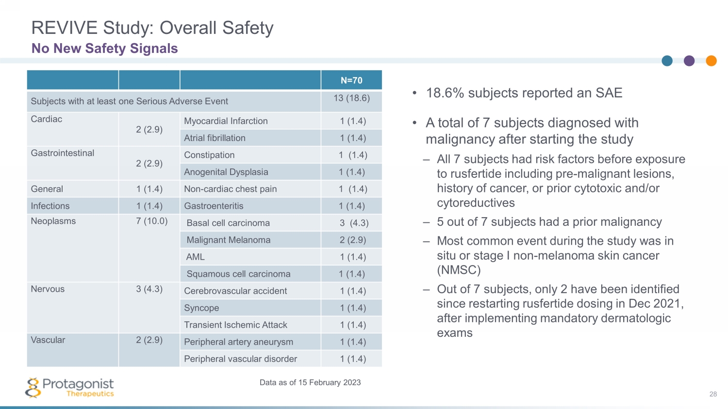 REVIVE Study – Safety and Exposure 27 • 70 subjects were enrolled in the rusfertide REVIVE study – 52 subjects (74.3%) have exposure ≥ 1 yr – 32 subjects (45.7%) have exposure ≥ 1.5 yrs – 10 subjects (14.3%) have exposure ≥ 2 yrs – 3 subjects (4.3%) have exposure ≥ 2.5 yrs • Rusfertide was generally well tolerated – A majority of TEAEs were Grade 1 or 2 ▪ There were no Grade 4 or 5 TEAEs – Most common TEAEs were injection site reactions (ISR) ▪ Events were localized, Grade 1 or 2 in severity, and generally did not lead to treatment discontinuation ▪ ISRs decreased in incidence with continued treatment – Symptoms associated with PV such as fatigue, pruritus, headache and dizziness were the second most common reported AEs – Two events related to treatment with rusfertide led to discontinuation (mild thrombocytosis and recurrent grade 1 injection site erythema) Rusfertide Was Generally Well Tolerated TEAEs by Preferred Term Noted at ≥15% N=70 Subjects with at least one TEAE 70 (100%) Injection site erythema 45 (64.3) Injection site pain 29 (41.4) Injection site pruritus 28 (40.0) Fatigue 22 (31.4) Injection site mass 18 (25.7) Pruritus 18 (25.7) Arthralgia 17 (24.3) Injection site swelling 17 (24.3) Dizziness 16 (22.9) Headache 16 (22.9) Nausea 16 (22.9) Anemia 14 (20.0) COVID - 19 14 (20.0) Injection site irritation 13 (18.6) Injection site bruising 11 (15.7) Data as of 15 February 2023