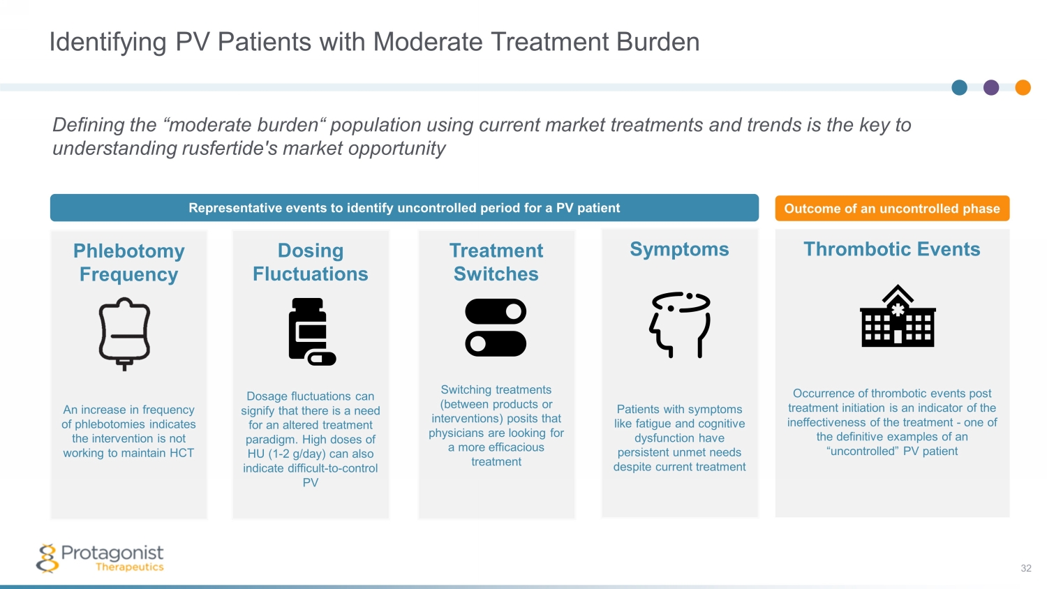 Identifying PV Patients with Moderate Treatment Burden Defining the “moderate burden“ population using current market treatments and trends is the key to understanding rusfertide's market opportunity Phlebotomy Frequency An increase in frequency of phlebotomies indicates the intervention is not working to maintain HCT Dosing Fluctuations Dosage fluctuations can signify that there is a need for an altered treatment paradigm. High doses of HU (1 - 2 g/day) can also indicate difficult - to - control PV Treatment Switches Switching treatments (between products or interventions) posits that physicians are looking for a more efficacious treatment Thrombotic Events Occurrence of thrombotic events post treatment initiation is an indicator of the ineffectiveness of the treatment - one of the definitive examples of an “uncontrolled” PV patient Symptoms Patients with symptoms like fatigue and cognitive dysfunction have persistent unmet needs despite current treatment Representative events to identify uncontrolled period for a PV patient Outcome of an uncontrolled phase 32