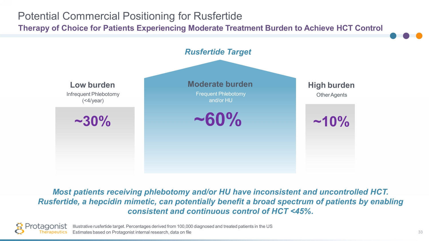 Potential Commercial Positioning for Rusfertide Therapy of Choice for Patients Experiencing Moderate Treatment Burden to Achieve HCT Control Low burden Infrequent Phlebotomy (<4/year) High burden Other Agents Moderate burden Frequent Phlebotomy and/or HU Illustrative rusfertide target. Percentages derived from 100,000 diagnosed and treated patients in the US Estimates based on Protagonist internal research, data on file ~30% ~60% ~10% Rusfertide Target Most patients receiving phlebotomy and/or HU have inconsistent and uncontrolled HCT. Rusfertide , a hepcidin mimetic, can potentially benefit a broad spectrum of patients by enabling consistent and continuous control of HCT <45%. 33