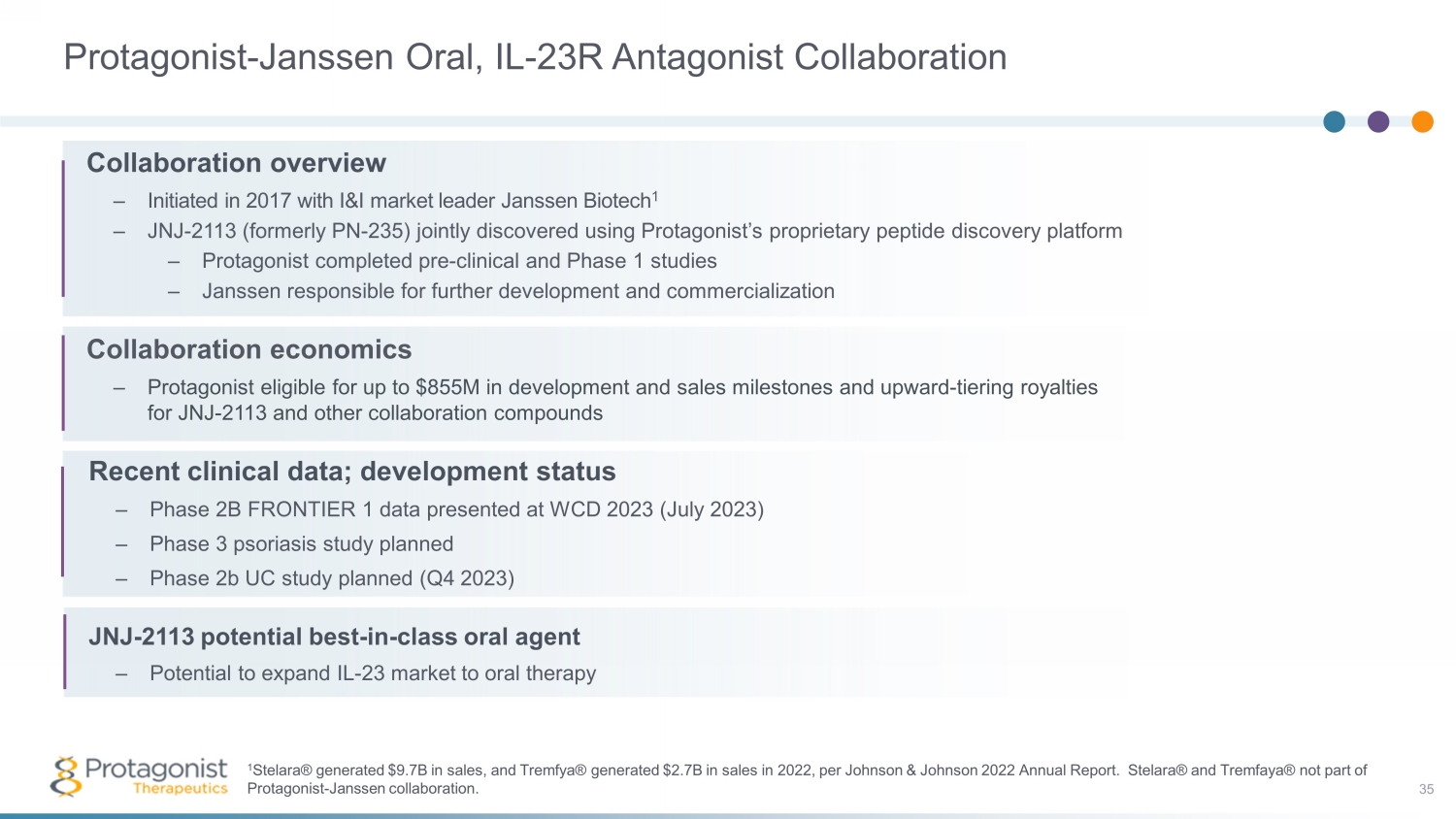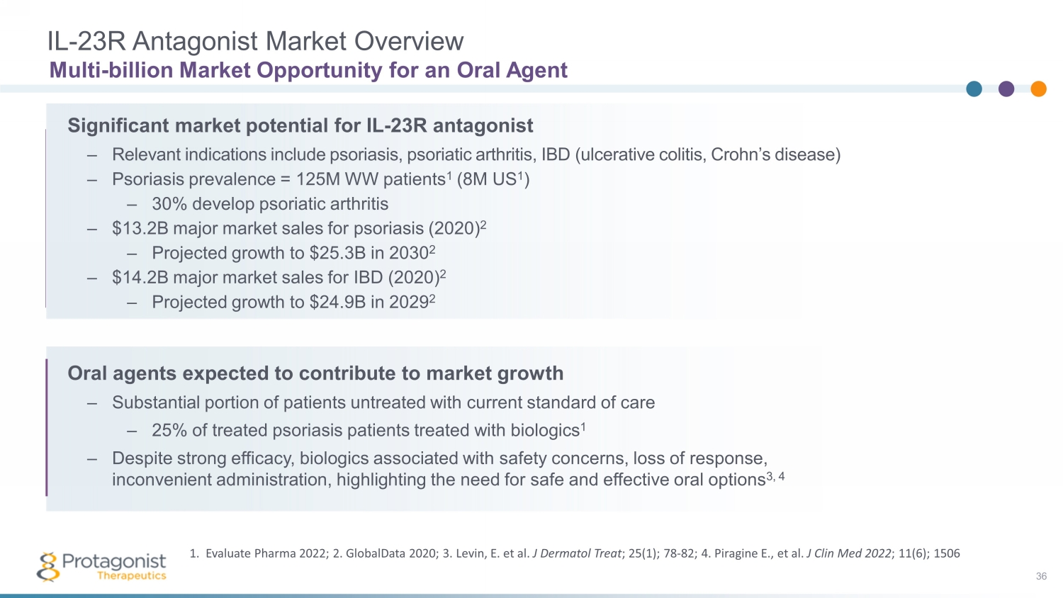 Protagonist - Janssen Oral, IL - 23R Antagonist Collaboration 35 1 Stelara® generated $9.7B in sales, and Tremfya® generated $2.7B in sales in 2022, per Johnson & Johnson 2022 Annual Report. Ste lara® and Tremfaya ® not part of Protagonist - Janssen collaboration. Collaboration overview – Initiated in 2017 with I&I market leader Janssen Biotech 1 – JNJ - 2113 (formerly PN - 235) jointly discovered using Protagonist’s proprietary peptide discovery platform – Protagonist completed pre - clinical and Phase 1 studies – Janssen responsible for further development and commercialization Collaboration economics – Protagonist eligible for up to $855M in development and sales milestones and upward - tiering royalties for JNJ - 2113 and other collaboration compounds Recent clinical data; development status – Phase 2B FRONTIER 1 data presented at WCD 2023 (July 2023) – Phase 3 psoriasis study planned – Phase 2b UC study planned (Q4 2023) JNJ - 2113 potential best - in - class oral agent – Potential to expand IL - 23 market to oral therapy