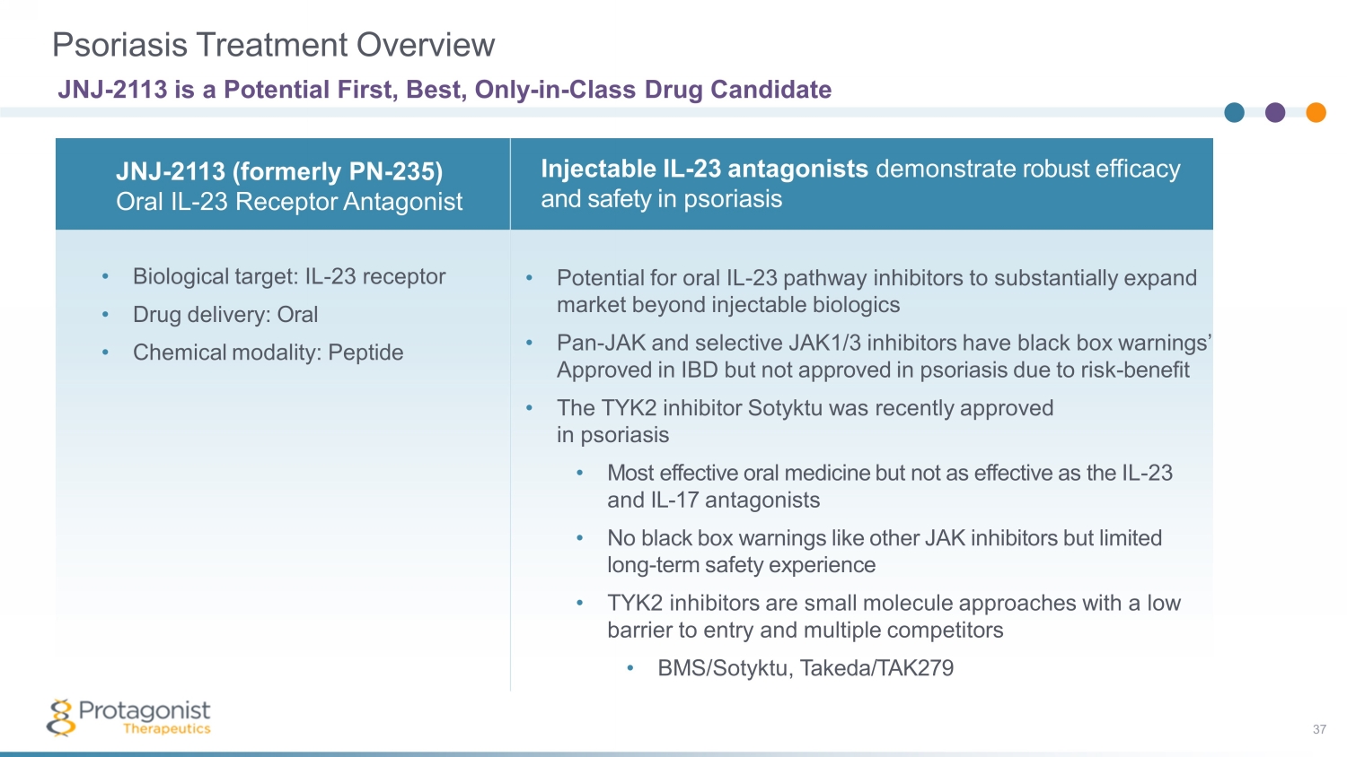 Psoriasis Treatment Overview JNJ - 2113 is a Potential First, Best, Only - in - Class Drug Candidate • Biological target: IL - 23 receptor • Drug delivery: Oral • Chemical modality: Peptide Injectable IL - 23 antagonists demonstrate robust efficacy and safety in psoriasis JNJ - 2113 (formerly PN - 235) Oral IL - 23 Receptor Antagonist • Potential for oral IL - 23 pathway inhibitors to substantially expand market beyond injectable biologics • Pan - JAK and selective JAK1/3 inhibitors have black box warnings’ Approved in IBD but not approved in psoriasis due to risk - benefit • The TYK2 inhibitor Sotyktu was recently approved in psoriasis • Most effective oral medicine but not as effective as the IL - 23 and IL - 17 antagonists • No black box warnings like other JAK inhibitors but limited long - term safety experience • TYK2 inhibitors are small molecule approaches with a low barrier to entry and multiple competitors • BMS/ Sotyktu , Takeda/TAK279 37