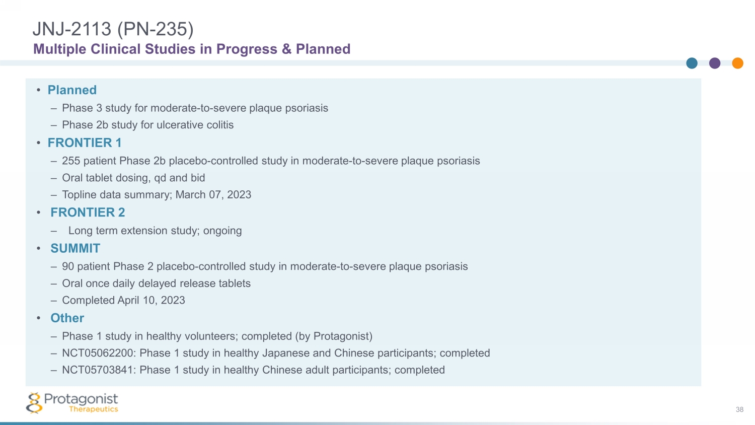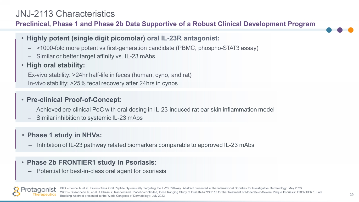JNJ - 2113 (PN - 235) 38 Multiple Clinical Studies in Progress & Planned • Planned – Phase 3 study for moderate - to - severe plaque psoriasis – Phase 2b study for ulcerative colitis • FRONTIER 1 – 255 patient Phase 2b placebo - controlled study in moderate - to - severe plaque psoriasis – Oral tablet dosing, qd and bid – Topline data summary; March 07, 2023 • FRONTIER 2 – Long term extension study; ongoing • SUMMIT – 90 patient Phase 2 placebo - controlled study in moderate - to - severe plaque psoriasis – Oral once daily delayed release tablets – Completed April 10, 2023 • Other – Phase 1 study in healthy volunteers; completed (by Protagonist) – NCT05062200: Phase 1 study in healthy Japanese and Chinese participants; completed – NCT05703841: Phase 1 study in healthy Chinese adult participants; completed
