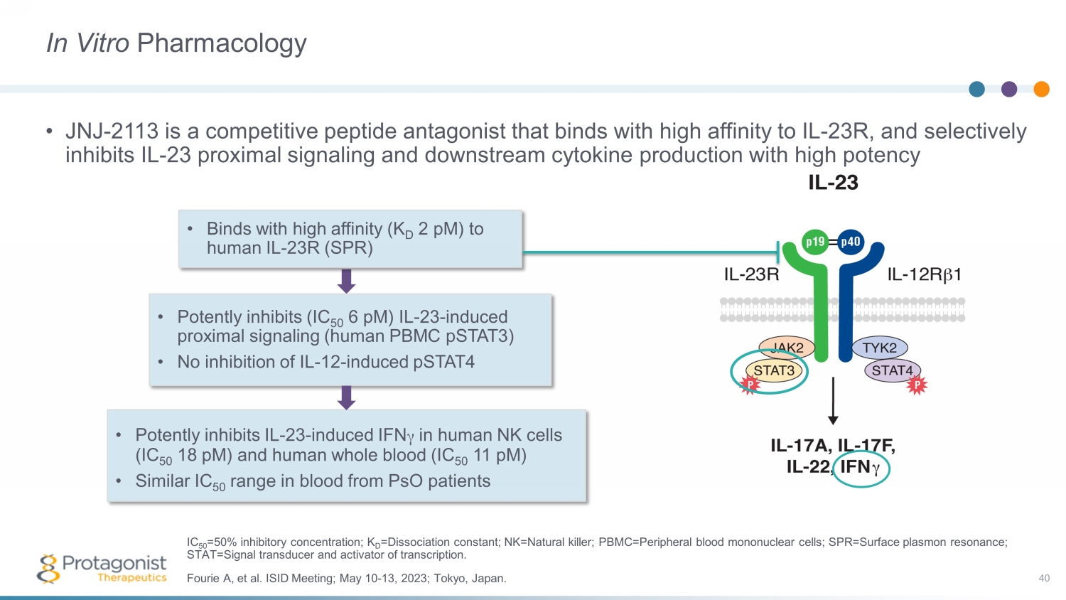 In Vitro Pharmacology • JNJ - 2113 is a competitive peptide antagonist that binds with high affinity to IL - 23R, and selectively inhibits IL - 23 proximal signaling and downstream cytokine production with high potency 40 • Binds with high affinity (K D 2 pM ) to human IL - 23R (SPR) • Potently inhibits (IC 50 6 pM ) IL - 23 - induced proximal signaling (human PBMC pSTAT3) • No inhibition of IL - 12 - induced pSTAT4 • Potently inhibits IL - 23 - induced IFN γ in human NK cells (IC 50 18 pM ) and human whole blood (IC 50 11 pM ) • Similar IC 50 range in blood from PsO patients Fourie A, et al. ISID Meeting; May 10 - 13, 2023; Tokyo, Japan. IC 50 =50% inhibitory concentration; K D =Dissociation constant; NK=Natural killer; PBMC=Peripheral blood mononuclear cells; SPR=Surface plasmon resonance; STAT=Signal transducer and activator of transcription.
