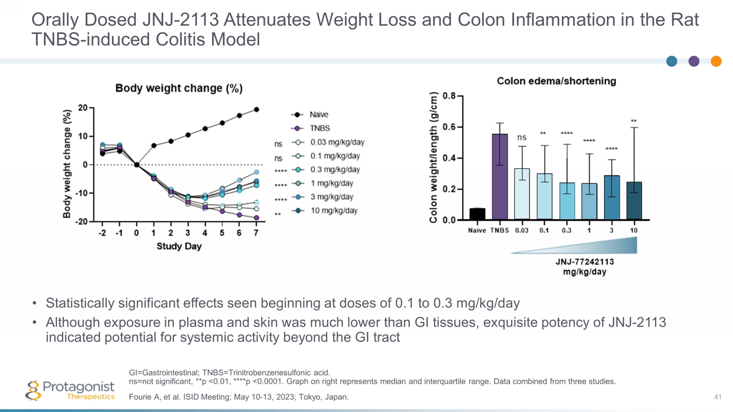 Orally Dosed JNJ - 2113 Attenuates Weight Loss and Colon Inflammation in the Rat TNBS - induced Colitis Model • Statistically significant effects seen beginning at doses of 0.1 to 0.3 mg/kg/day • Although exposure in plasma and skin was much lower than GI tissues, exquisite potency of JNJ - 2113 indicated potential for systemic activity beyond the GI tract 41 Fourie A, et al. ISID Meeting; May 10 - 13, 2023; Tokyo, Japan. GI=Gastrointestinal; TNBS= Trinitrobenzenesulfonic acid. ns=not significant, **p <0.01, ****p <0.0001. Graph on right represents median and interquartile range. Data combined from th ree studies.