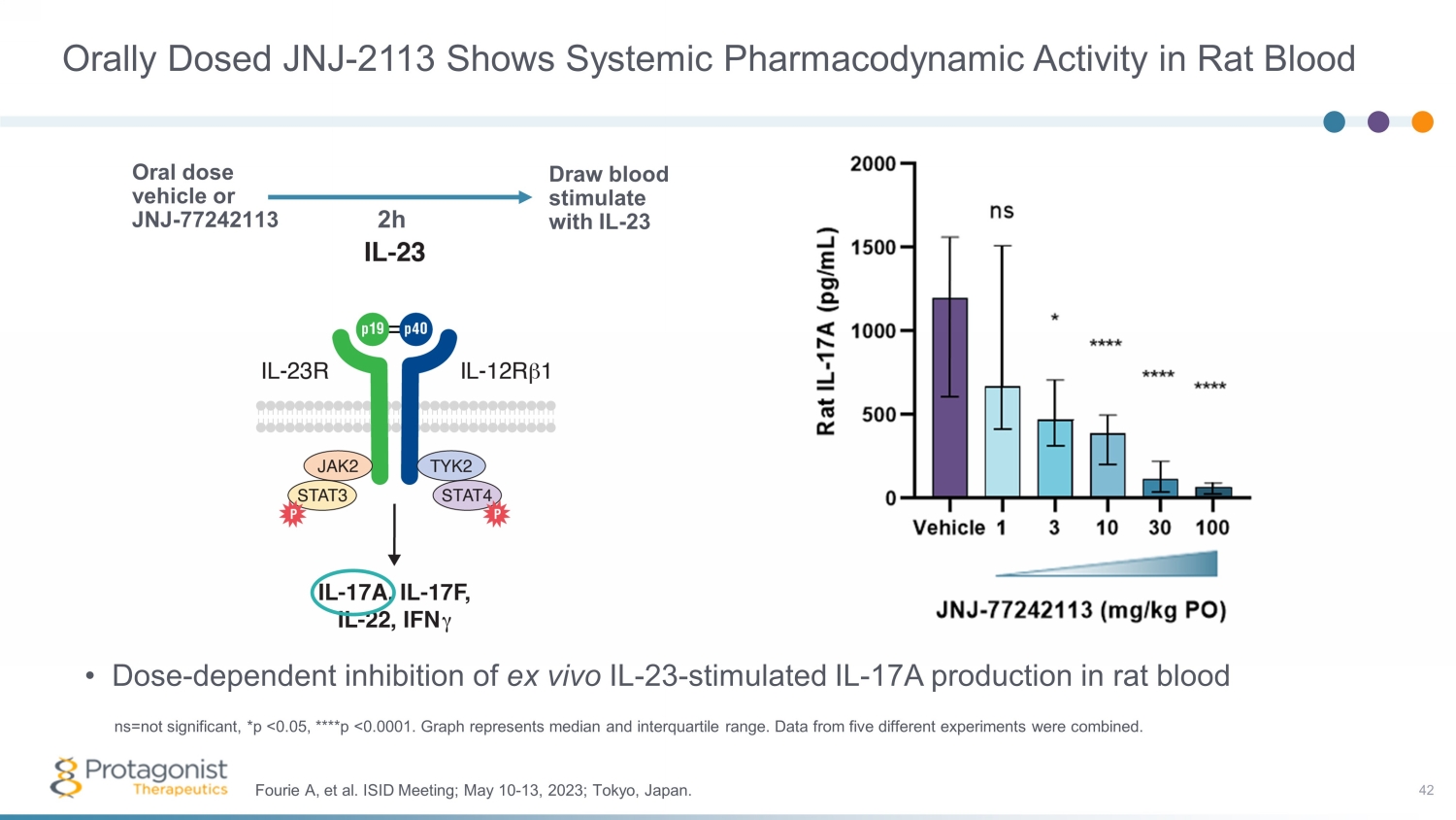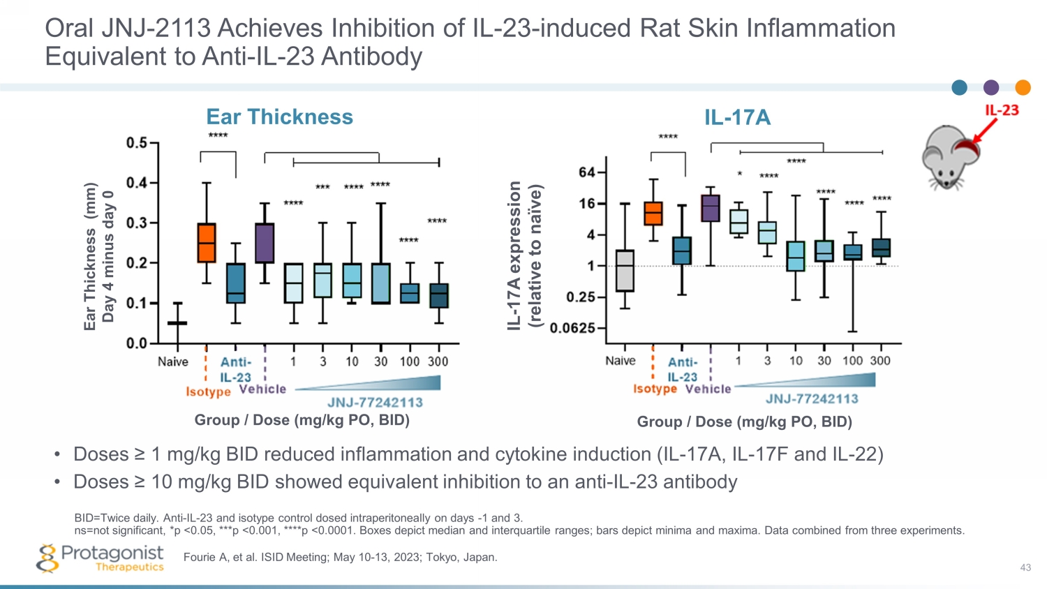 Orally Dosed JNJ - 2113 Shows Systemic Pharmacodynamic Activity in Rat Blood • Dose - dependent inhibition of ex vivo IL - 23 - stimulated IL - 17A production in rat blood 42 Fourie A, et al. ISID Meeting; May 10 - 13, 2023; Tokyo, Japan. ns=not significant, *p <0.05, ****p <0.0001. Graph represents median and interquartile range. Data from five different experi men ts were combined. Oral dose vehicle or JNJ - 77242113 Draw blood stimulate with IL - 23 2h