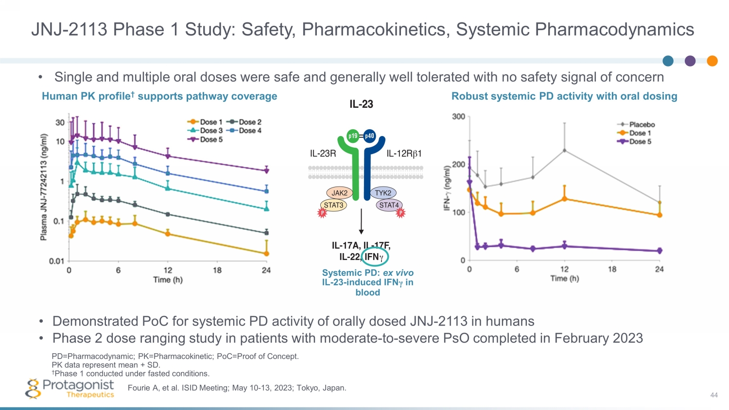 JNJ - 2113 Phase 1 Study: Safety, Pharmacokinetics, Systemic Pharmacodynamics • Demonstrated PoC for systemic PD activity of orally dosed JNJ - 2113 in humans • Phase 2 dose ranging study in patients with moderate - to - severe PsO completed in February 2023 44 Fourie A, et al. ISID Meeting; May 10 - 13, 2023; Tokyo, Japan. PD=Pharmacodynamic; PK=Pharmacokinetic; PoC=Proof of Concept. PK data represent mean + SD. † Phase 1 conducted under fasted conditions. • Single and multiple oral doses were safe and generally well tolerated with no safety signal of concern Human PK profile † supports pathway coverage Systemic P D: ex vivo IL - 23 - induced IFN γ in blood Robust systemic PD activity with oral dosing