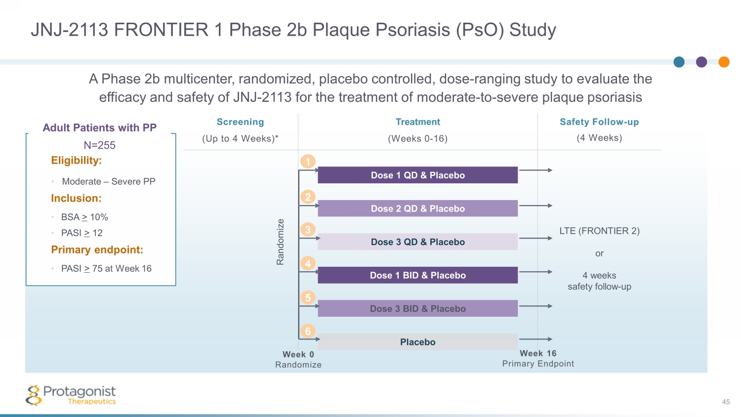 JNJ - 2113 FRONTIER 1 Phase 2b Plaque Psoriasis ( PsO ) Study 45 Adult Patients with PP N=255 Eligibility: • Moderate – Severe PP Inclusion: • BSA > 10% • PASI > 12 Primary endpoint: • PASI > 75 at Week 16 Screening Treatment Safety Follow - up (4 Weeks) (Up to 4 Weeks)* (Weeks 0 - 16) Dose 1 QD & Placebo LTE (FRONTIER 2) or 4 weeks safety follow - up Dose 2 QD & Placebo Dose 3 QD & Placebo Dose 1 BID & Placebo Dose 3 BID & Placebo Placebo Week 0 Randomize Week 16 Primary Endpoint Randomize 2 1 3 4 5 6 A Phase 2b multicenter, randomized, placebo controlled, dose - ranging study to evaluate the efficacy and safety of JNJ - 2113 for the treatment of moderate - to - severe plaque psoriasis