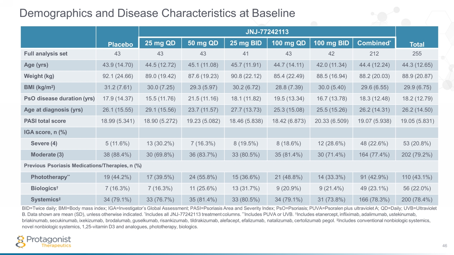 Demographics and Disease Characteristics at Baseline BID=Twice daily; BMI=Body mass index; IGA=Investigator’s Global Assessment; PASI=Psoriasis Area and Severity Index; PsO=Psoriasis; PUVA=Psoralen plus ultraviolet A; QD=Daily; UVB=Ultraviolet B. Data shown are mean (SD), unless otherwise indicated. * Includes all JNJ - 77242113 treatment columns. ** Includes PUVA or UVB. † Includes etanercept, infliximab, adalimumab, ustekinumab, briakinumab, secukinumab , ixekizumab, brodalumab, guselkumab, risankizumab, tildrakizumab, alefacept, efalizumab, natalizumab, certolizumab pegol. ‡ Includes conventional nonbiologic systemics, novel nonbiologic systemics, 1,25 - vitamin D3 and analogues, phototherapy, biologics. Placebo JNJ - 77242113 Total 25 mg QD 50 mg QD 25 mg BID 100 mg QD 100 mg BID Combined * Full analysis set 43 43 43 41 43 42 212 255 Age (yrs) 43.9 (14.70) 44.5 (12.72) 45.1 (11.08) 45.7 (11.91) 44.7 (14.11) 42.0 (11.34) 44.4 (12.24) 44.3 (12.65) Weight (kg) 92.1 (24.66) 89.0 (19.42) 87.6 (19.23) 90.8 (22.12) 85.4 (22.49) 88.5 (16.94) 88.2 (20.03) 88.9 (20.87) BMI (kg/m 2 ) 31.2 (7.61) 30.0 (7.25) 29.3 (5.97) 30.2 (6.72) 28.8 (7.39) 30.0 (5.40) 29.6 (6.55) 29.9 (6.75) PsO disease duration (yrs) 17.9 (14.37) 15.5 (11.76) 21.5 (11.16) 18.1 (11.82) 19.5 (13.34) 16.7 (13.78) 18.3 (12.48) 18.2 (12.79) Age at diagnosis (yrs) 26.1 (15.55) 29.1 (15.56) 23.7 (11.57) 27.7 (13.73) 25.3 (15.08) 25.5 (15.26) 26.2 (14.31) 26.2 (14.50) PASI total score 18.99 (5.341) 18.90 (5.272) 19.23 (5.082) 18.46 (5.838) 18.42 (6.873) 20.33 (6.509) 19.07 (5.938) 19.05 (5.831) IGA score, n (%) Severe (4) 5 (11.6%) 13 (30.2%) 7 (16.3%) 8 (19.5%) 8 (18.6%) 12 (28.6%) 48 (22.6%) 53 (20.8%) Moderate (3) 38 (88.4%) 30 (69.8%) 36 (83.7%) 33 (80.5%) 35 (81.4%) 30 (71.4%) 164 (77.4%) 202 (79.2%) Previous Psoriasis Medications/Therapies, n (%) Phototherapy ** 19 (44.2%) 17 (39.5%) 24 (55.8%) 15 (36.6%) 21 (48.8%) 14 (33.3%) 91 (42.9%) 110 (43.1%) Biologics † 7 (16.3%) 7 (16.3%) 11 (25.6%) 13 (31.7%) 9 (20.9%) 9 (21.4%) 49 (23.1%) 56 (22.0%) Systemics ‡ 34 (79.1%) 33 (76.7%) 35 (81.4%) 33 (80.5%) 34 (79.1%) 31 (73.8%) 166 (78.3%) 200 (78.4%) 46
