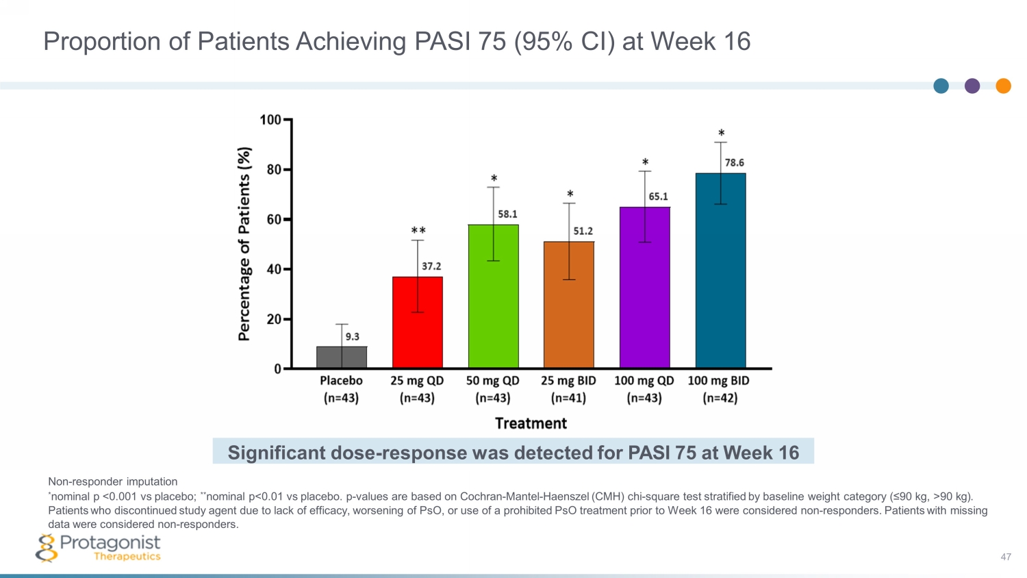 Non - responder imputation * nominal p <0.001 vs placebo; ** nominal p<0.01 vs placebo. p - values are based on Cochran - Mantel - Haenszel (CMH) chi - square test stratified by baseline weight category (≤90 kg, >90 kg). Patients who discontinued study agent due to lack of efficacy, worsening of PsO, or use of a prohibited PsO treatment prior to Week 16 were considered non - responders. Patients with missing data were considered non - responders. Significant dose - response was detected for PASI 75 at Week 16 Proportion of Patients Achieving PASI 75 (95% CI) at Week 16 47