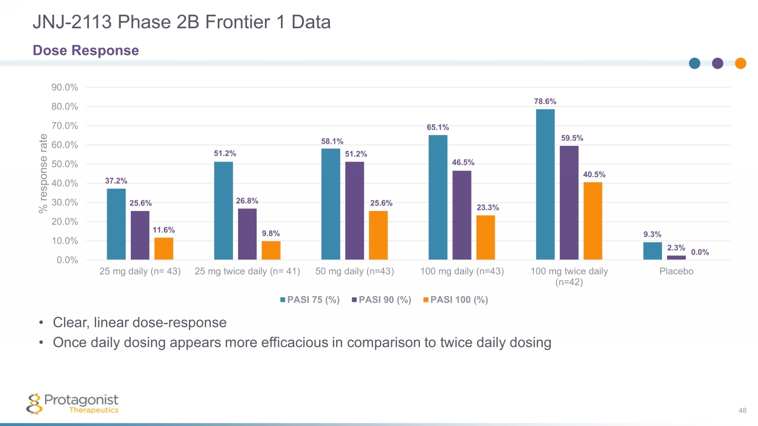 JNJ - 2113 Phase 2B Frontier 1 Data 48 37.2% 51.2% 58.1% 65.1% 78.6% 9.3% 25.6% 26.8% 51.2% 46.5% 59.5% 2.3% 11.6% 9.8% 25.6% 23.3% 40.5% 0.0% 0.0% 10.0% 20.0% 30.0% 40.0% 50.0% 60.0% 70.0% 80.0% 90.0% 25 mg daily (n= 43) 25 mg twice daily (n= 41) 50 mg daily (n=43) 100 mg daily (n=43) 100 mg twice daily (n=42) Placebo % response rate PASI 75 (%) PASI 90 (%) PASI 100 (%) Dose Response • Clear, linear dose - response • Once daily dosing appears more efficacious in comparison to twice daily dosing