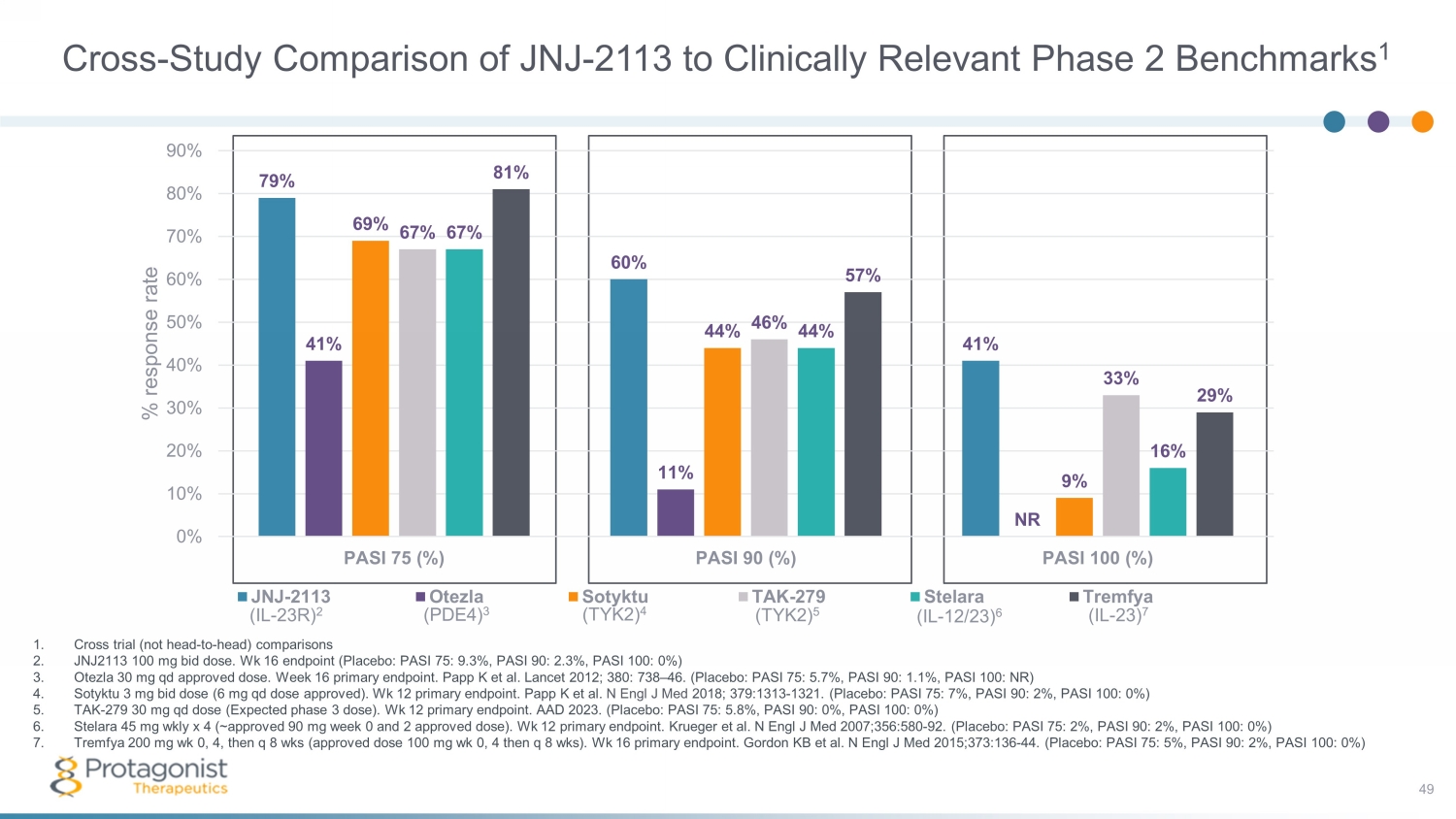 Cross - Study Comparison of JNJ - 2113 to Clinically Relevant Phase 2 Benchmarks 1 49 1. Cross trial (not head - to - head) comparisons 2. J NJ2113 100 mg bid dose. Wk 16 endpoint (Placebo: PASI 75: 9.3%, PASI 90: 2.3%, PASI 100: 0%) 3. Otezla 30 mg qd approved dose. Week 16 primary endpoint. Papp K et al. Lancet 2012; 380: 738 – 46. (Placebo: PASI 75: 5.7%, PASI 90: 1.1%, PASI 100: NR) 4. Sotyktu 3 mg bid dose (6 mg qd dose approved). Wk 12 primary endpoint. Papp K et al. N Engl J Med 2018; 379:1313 - 1321. (Placebo: PASI 75: 7%, PASI 90: 2%, PASI 100: 0%) 5. TAK - 279 30 mg qd dose (Expected phase 3 dose). Wk 12 primary endpoint. AAD 2023. (Placebo: PASI 75: 5.8%, PASI 90: 0%, PASI 100: 0%) 6. Stelara 45 mg wkly x 4 (~approved 90 mg week 0 and 2 approved dose). Wk 12 primary endpoint. Krueger et al. N Engl J Med 2007;356:580 - 92. (Placebo: PASI 75: 2%, PASI 90: 2%, PASI 100: 0%) 7. Tremfya 200 mg wk 0, 4, then q 8 wks (approved dose 100 mg wk 0, 4 then q 8 wks ). Wk 16 primary endpoint. Gordon KB et al. N Engl J Med 2015;373:136 - 44. (Placebo: PASI 75: 5%, PASI 90: 2%, PASI 100: 0%) (IL - 23R) 2 (PDE4) 3 (TYK2) 4 (TYK2) 5 (IL - 12/23) 6 (IL - 23) 7 79% 60% 41% 41% 11% NR 69% 44% 9% 67% 46% 33% 67% 44% 16% 81% 57% 29% 0% 10% 20% 30% 40% 50% 60% 70% 80% 90% PASI 75 (%) PASI 90 (%) PASI 100 (%) % response rate JNJ-2113 Otezla Sotyktu TAK-279 Stelara Tremfya