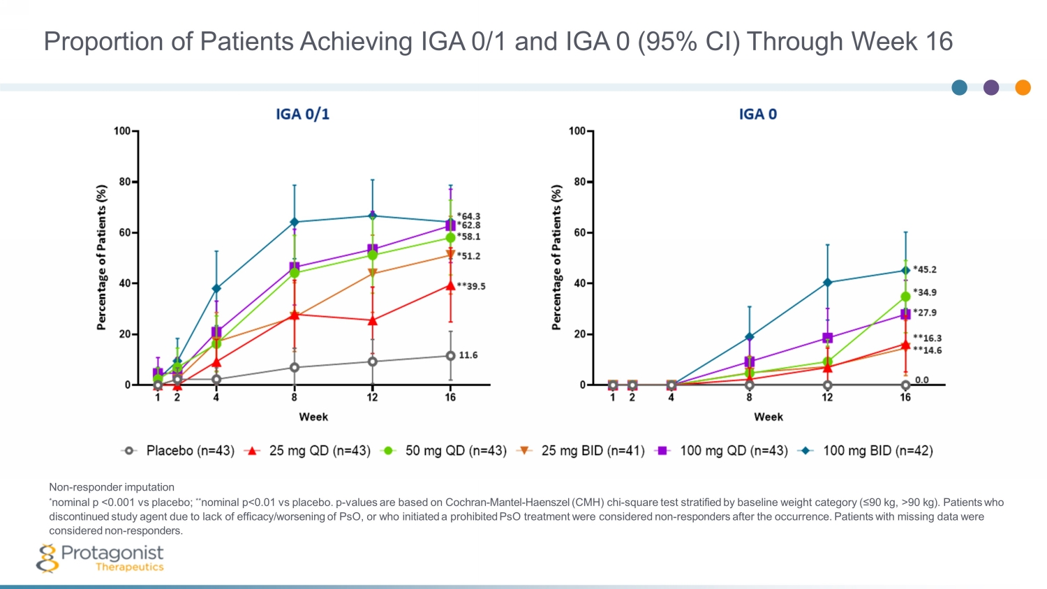 Proportion of Patients Achieving IGA 0/1 and IGA 0 (95% CI) Through Week 16 Non - responder imputation * nominal p <0.001 vs placebo; ** nominal p<0.01 vs placebo. p - values are based on Cochran - Mantel - Haenszel (CMH) chi - square test stratified by baseline weight category (≤90 kg, >90 kg). Patients who discontinued study agent due to lack of efficacy/worsening of PsO, or who initiated a prohibited PsO treatment were considered non - responders after the occurrence. Patients with missing data were considered non - responders.