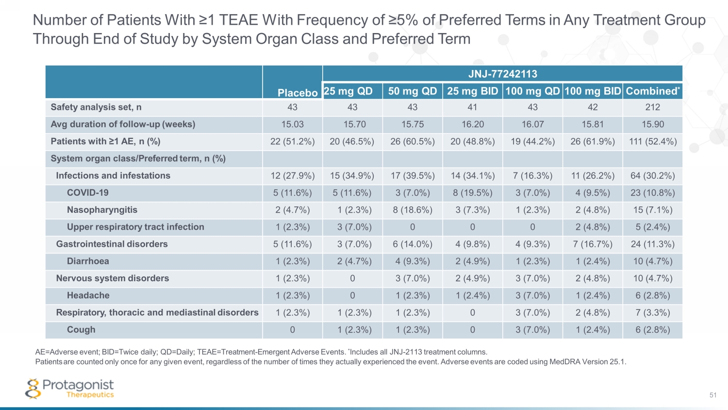 Number of Patients With ≥1 TEAE With Frequency of ≥5% of Preferred Terms in Any Treatment Group Through End of Study by System Organ Class and Preferred Term AE=Adverse event; BID=Twice daily; QD=Daily; TEAE=Treatment - Emergent Adverse Events. * Includes all JNJ - 2113 treatment columns. Patients are counted only once for any given event, regardless of the number of times they actually experienced the event. Adverse events are coded using MedDRA Version 25.1. Placebo JNJ - 77242113 25 mg QD 50 mg QD 25 mg BID 100 mg QD 100 mg BID Combined * Safety analysis set, n 43 43 43 41 43 42 212 Avg duration of follow - up (weeks) 15.03 15.70 15.75 16.20 16.07 15.81 15.90 Patients with ≥1 AE, n (%) 22 (51.2%) 20 (46.5%) 26 (60.5%) 20 (48.8%) 19 (44.2%) 26 (61.9%) 111 (52.4%) System organ class/Preferred term, n (%) Infections and infestations 12 (27.9%) 15 (34.9%) 17 (39.5%) 14 (34.1%) 7 (16.3%) 11 (26.2%) 64 (30.2%) COVID - 19 5 (11.6%) 5 (11.6%) 3 (7.0%) 8 (19.5%) 3 (7.0%) 4 (9.5%) 23 (10.8%) Nasopharyngitis 2 (4.7%) 1 (2.3%) 8 (18.6%) 3 (7.3%) 1 (2.3%) 2 (4.8%) 15 (7.1%) Upper respiratory tract infection 1 (2.3%) 3 (7.0%) 0 0 0 2 (4.8%) 5 (2.4%) Gastrointestinal disorders 5 (11.6%) 3 (7.0%) 6 (14.0%) 4 (9.8%) 4 (9.3%) 7 (16.7%) 24 (11.3%) Diarrhoea 1 (2.3%) 2 (4.7%) 4 (9.3%) 2 (4.9%) 1 (2.3%) 1 (2.4%) 10 (4.7%) Nervous system disorders 1 (2.3%) 0 3 (7.0%) 2 (4.9%) 3 (7.0%) 2 (4.8%) 10 (4.7%) Headache 1 (2.3%) 0 1 (2.3%) 1 (2.4%) 3 (7.0%) 1 (2.4%) 6 (2.8%) Respiratory, thoracic and mediastinal disorders 1 (2.3%) 1 (2.3%) 1 (2.3%) 0 3 (7.0%) 2 (4.8%) 7 (3.3%) Cough 0 1 (2.3%) 1 (2.3%) 0 3 (7.0%) 1 (2.4%) 6 (2.8%) 51