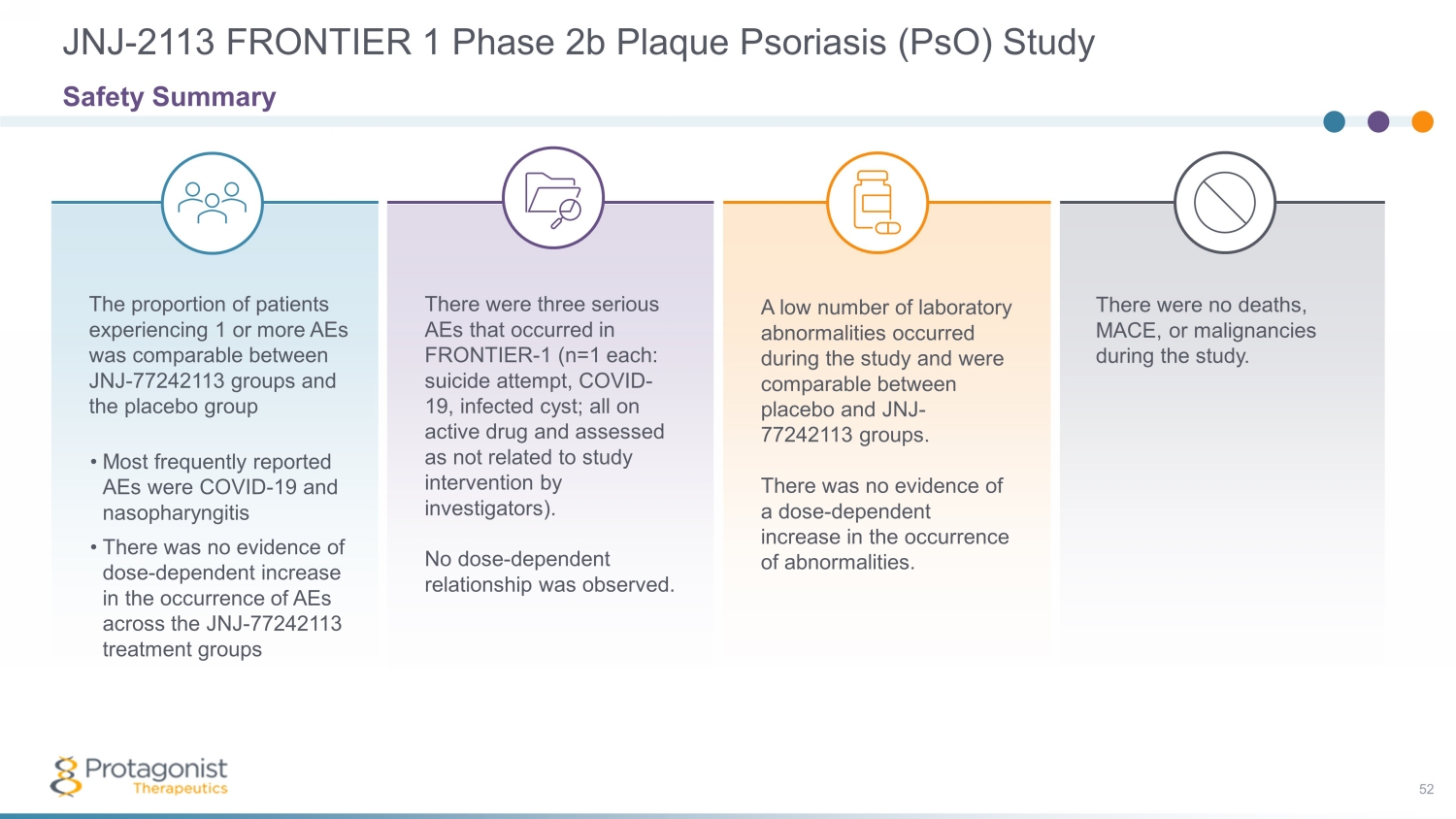 There were no deaths, MACE, or malignancies during the study. A low number of laboratory abnormalities occurred during the study and were comparable between placebo and JNJ - 77242113 groups. There was no evidence of a dose - dependent increase in the occurrence of abnormalities. There were three serious AEs that occurred in FRONTIER - 1 (n=1 each: suicide attempt, COVID - 19, infected cyst; all on active drug and assessed as not related to study intervention by investigators). No dose - dependent relationship was observed. The proportion of patients experiencing 1 or more AEs was comparable between JNJ - 77242113 groups and the placebo group • Most frequently reported AEs were COVID - 19 and nasopharyngitis • There was no evidence of dose - dependent increase in the occurrence of AEs across the JNJ - 77242113 treatment groups JNJ - 2113 FRONTIER 1 Phase 2b Plaque Psoriasis ( PsO ) Study 52 Safety Summary