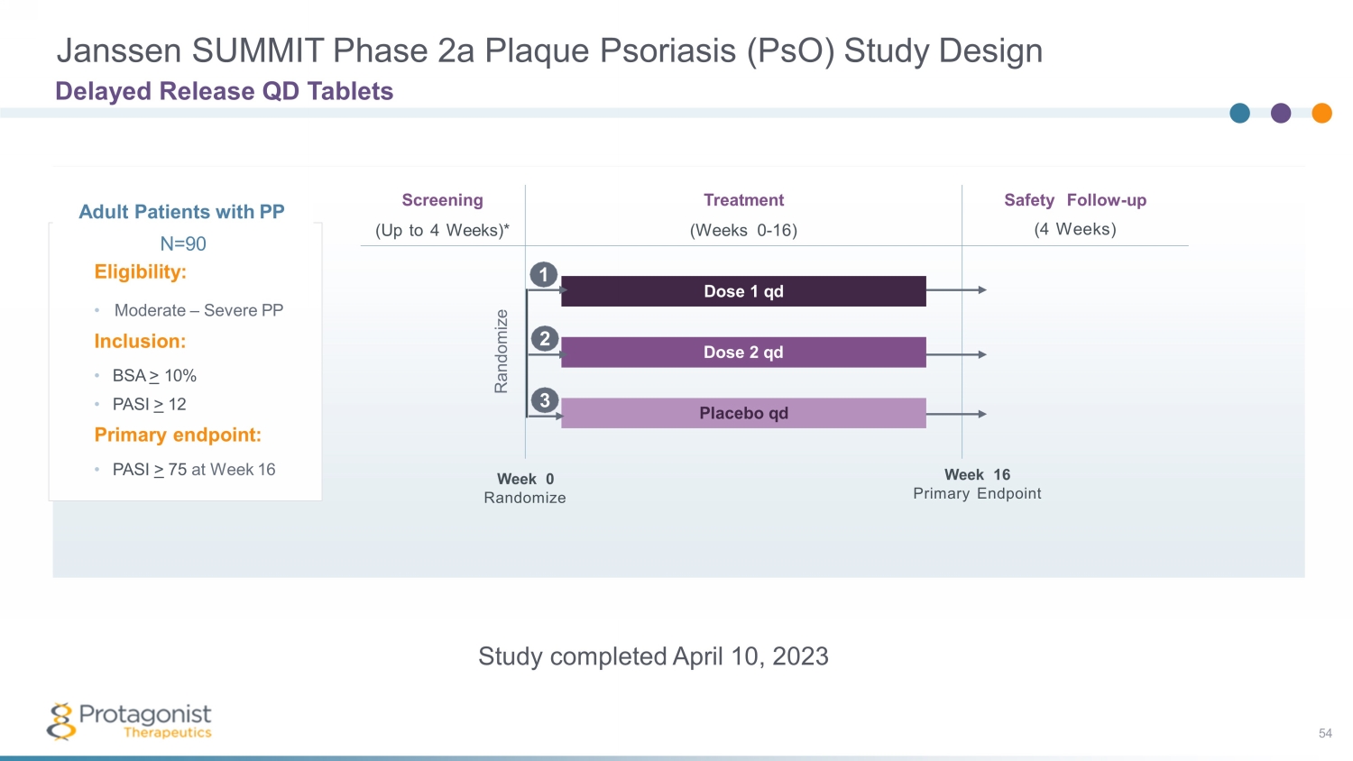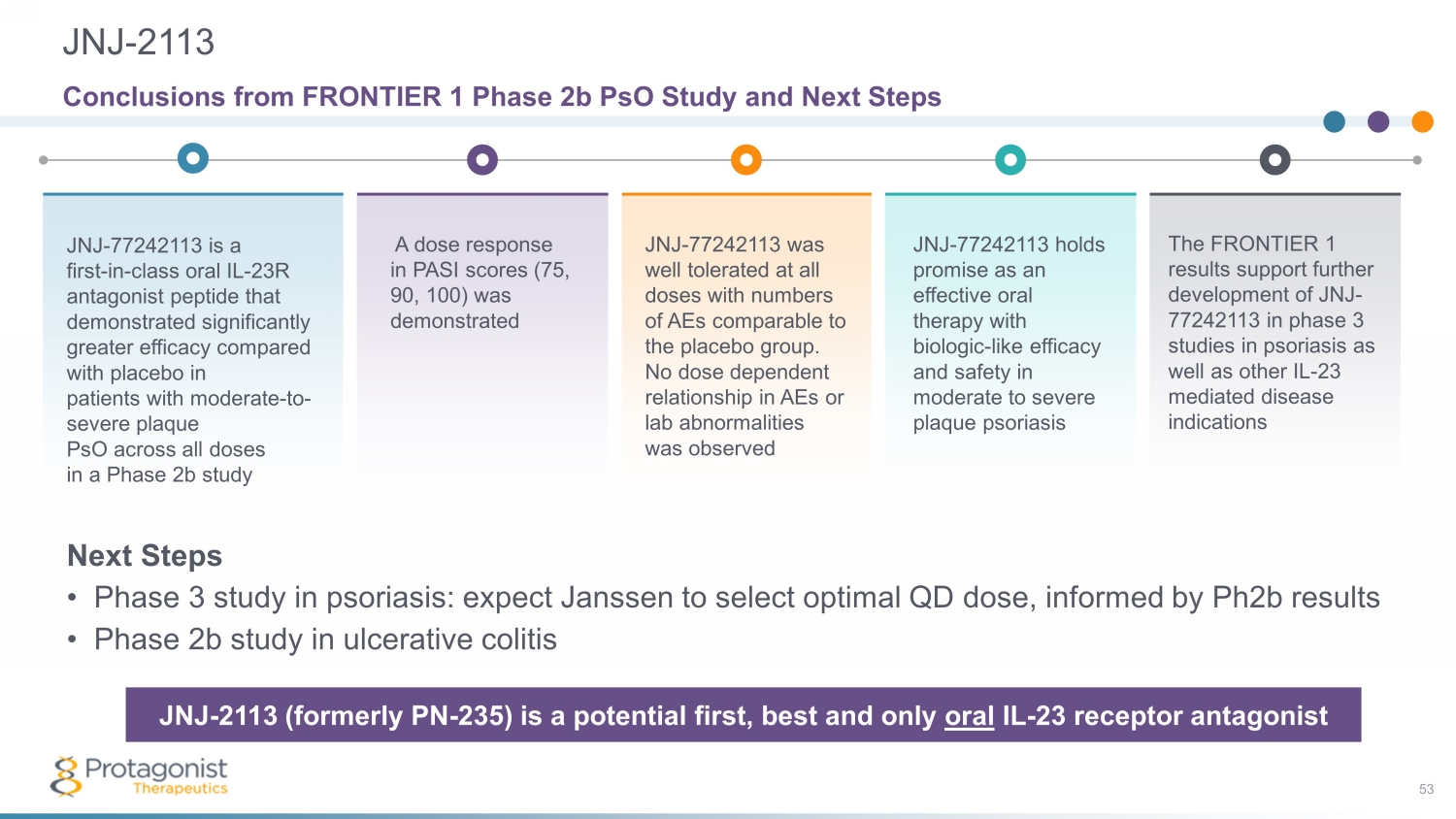 JNJ - 2113 53 The FRONTIER 1 results support further development of JNJ - 77242113 in phase 3 studies in psoriasis as well as other IL - 23 mediated disease indications Conclusions from FRONTIER 1 Phase 2b PsO Study and Next Steps A dose response in PASI scores (75, 90, 100) was demonstrated JNJ - 77242113 is a first - in - class oral IL - 23R antagonist peptide that demonstrated significantly greater efficacy compared with placebo in patients with moderate - to - severe plaque PsO across all doses in a Phase 2b study JNJ - 77242113 was well tolerated at all doses with numbers of AEs comparable to the placebo group. No dose dependent relationship in AEs or lab abnormalities was observed JNJ - 77242113 holds promise as an effective oral therapy with biologic - like efficacy and safety in moderate to severe plaque psoriasis JNJ - 2113 (formerly PN - 235) is a potential first, best and only oral IL - 23 receptor antagonist Next Steps • Phase 3 study in psoriasis: expect Janssen to select optimal QD dose, informed by Ph2b results • Phase 2b study in ulcerative colitis