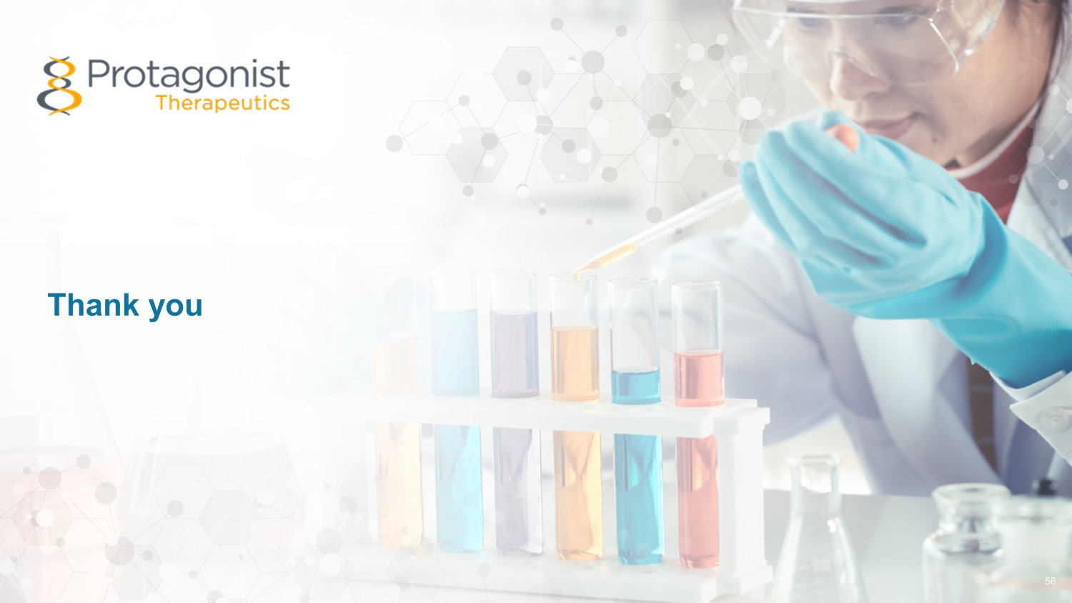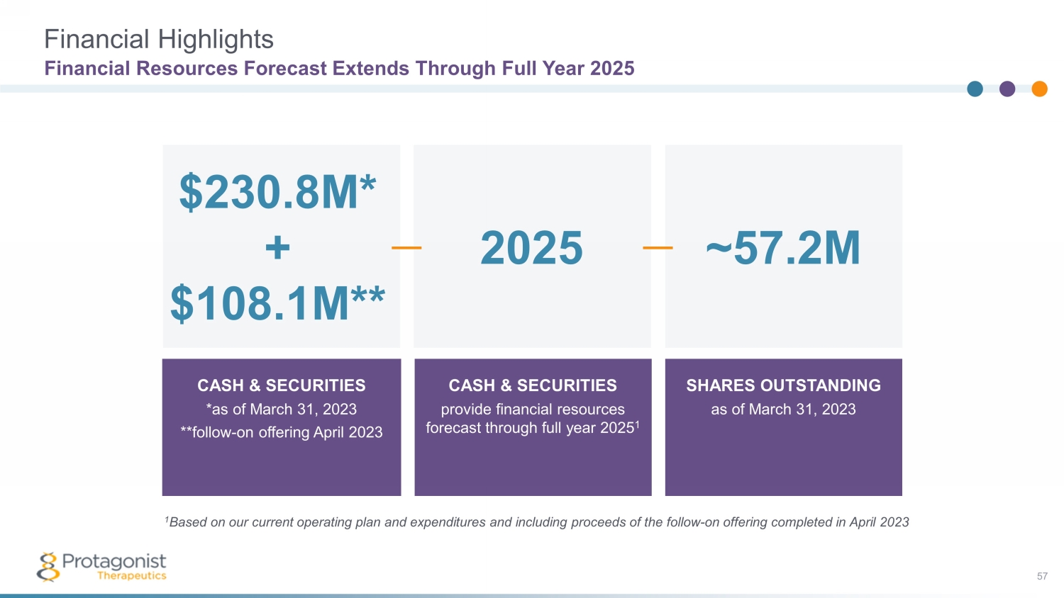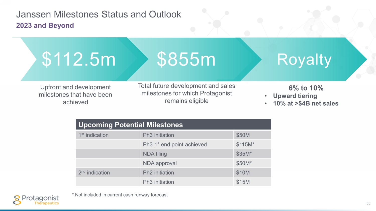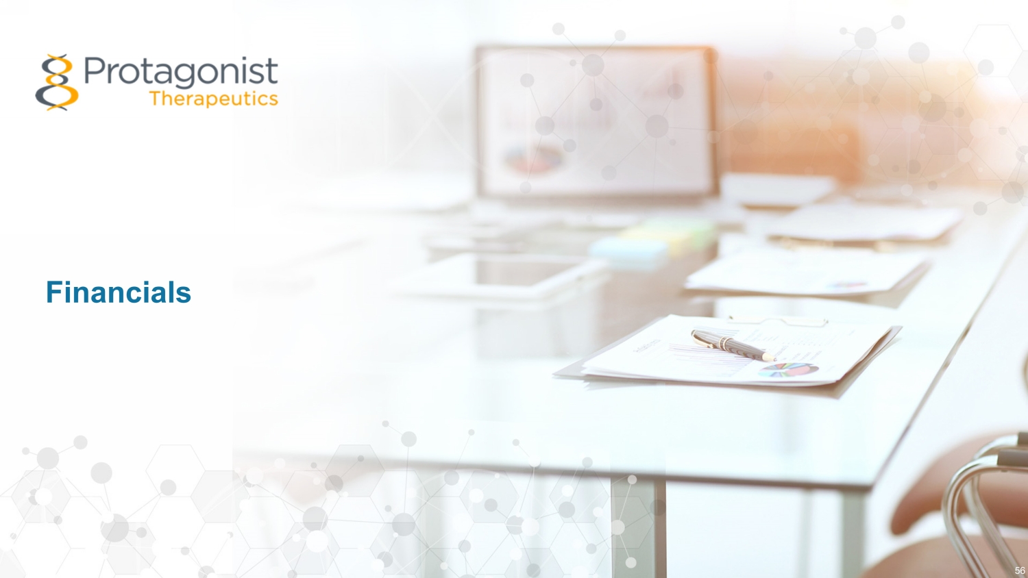 Royalty Janssen Milestones Status and Outlook 55 2023 and Beyond $112.5m $855m Total future development and sales milestones for which Protagonist remains eligible Upfront and development milestones that have been achieved 6% to 10% • Upward tiering • 10% at >$4B net sales Upcoming Potential Milestones 1 st indication Ph3 initiation $50M Ph3 1 ° end point achieved $115M* NDA filing $35M* NDA approval $50M* 2 nd indication Ph2 initiation $10M Ph3 initiation $15M * Not included in current cash runway forecast