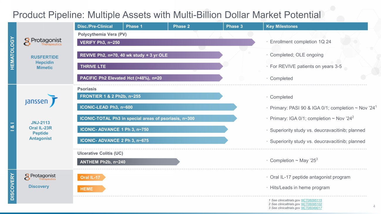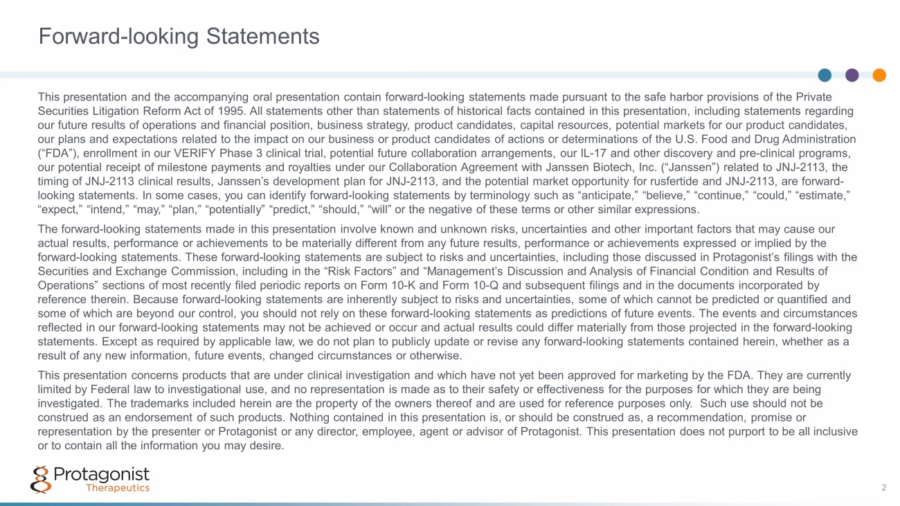 Forward - looking Statements 2 This presentation and the accompanying oral presentation contain forward - looking statements made pursuant to the safe harbor pro visions of the Private Securities Litigation Reform Act of 1995. All statements other than statements of historical facts contained in this presenta tio n, including statements regarding our future results of operations and financial position, business strategy, product candidates, capital resources, potential mar kets for our product candidates, our plans and expectations related to the impact on our business or product candidates of actions or determinations of the U. S. Food and Drug Administration (“FDA”), enrollment in our VERIFY Phase 3 clinical trial, potential future collaboration arrangements, our IL - 17 and other disco very and pre - clinical programs, our potential receipt of milestone payments and royalties under our Collaboration Agreement with Janssen Biotech, Inc. (“Jans sen ”) related to JNJ - 2113, the timing of JNJ - 2113 clinical results, Janssen’s development plan for JNJ - 2113, and the potential market opportunity for rusfertid e and JNJ - 2113, are forward - looking statements. In some cases, you can identify forward - looking statements by terminology such as “anticipate,” “believe,” “ continue,” “could,” “estimate,” “expect,” “intend,” “may,” “plan,” “potentially” “predict,” “should,” “will” or the negative of these terms or other similar exp ressions. The forward - looking statements made in this presentation involve known and unknown risks, uncertainties and other important fact ors that may cause our actual results, performance or achievements to be materially different from any future results, performance or achievements e xpr essed or implied by the forward - looking statements. These forward - looking statements are subject to risks and uncertainties, including those discussed i n Protagonist’s filings with the Securities and Exchange Commission, including in the “Risk Factors” and “Management’s Discussion and Analysis of Financial Co ndi tion and Results of Operations” sections of most recently filed periodic reports on Form 10 - K and Form 10 - Q and subsequent filings and in the docume nts incorporated by reference therein. Because forward - looking statements are inherently subject to risks and uncertainties, some of which cannot be predicted or quantified and some of which are beyond our control, you should not rely on these forward - looking statements as predictions of future events. T he events and circumstances reflected in our forward - looking statements may not be achieved or occur and actual results could differ materially from those p rojected in the forward - looking statements. Except as required by applicable law, we do not plan to publicly update or revise any forward - looking statements con tained herein, whether as a result of any new information, future events, changed circumstances or otherwise. This presentation concerns products that are under clinical investigation and which have not yet been approved for marketing by the FDA. They are currently limited by Federal law to investigational use, and no representation is made as to their safety or effectiveness for the purp ose s for which they are being investigated. The trademarks included herein are the property of the owners thereof and are used for reference purposes only. S uch use should not be construed as an endorsement of such products. Nothing contained in this presentation is, or should be construed as, a recomme nda tion, promise or representation by the presenter or Protagonist or any director, employee, agent or advisor of Protagonist. This presentation doe s not purport to be all inclusive or to contain all the information you may desire.