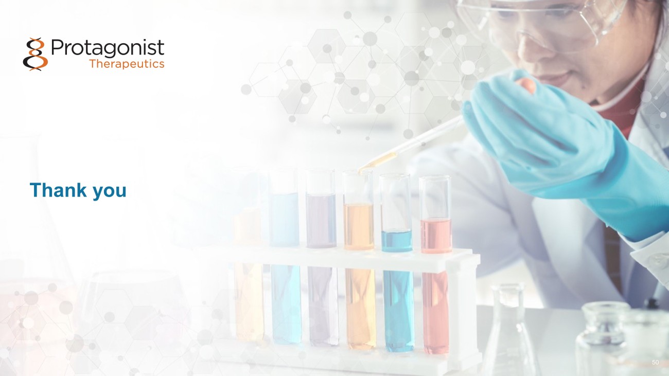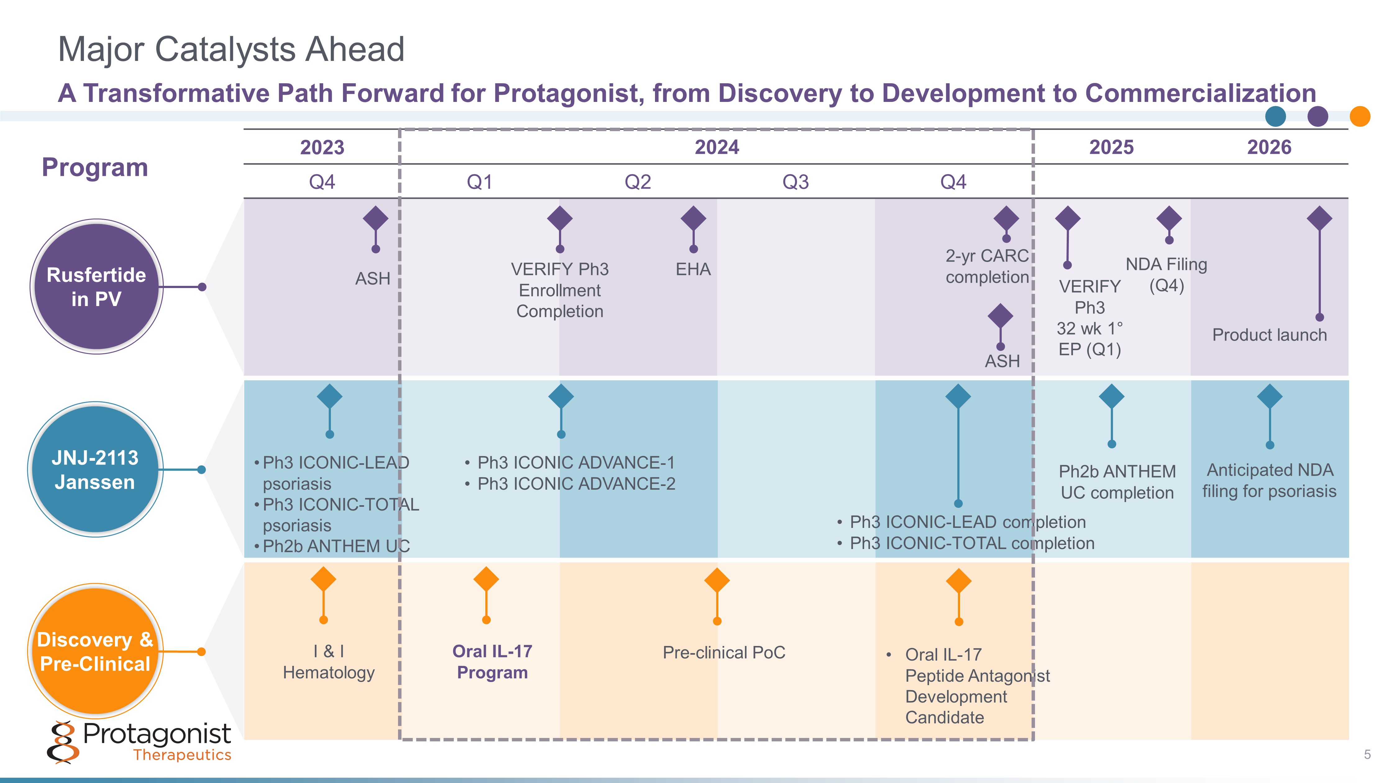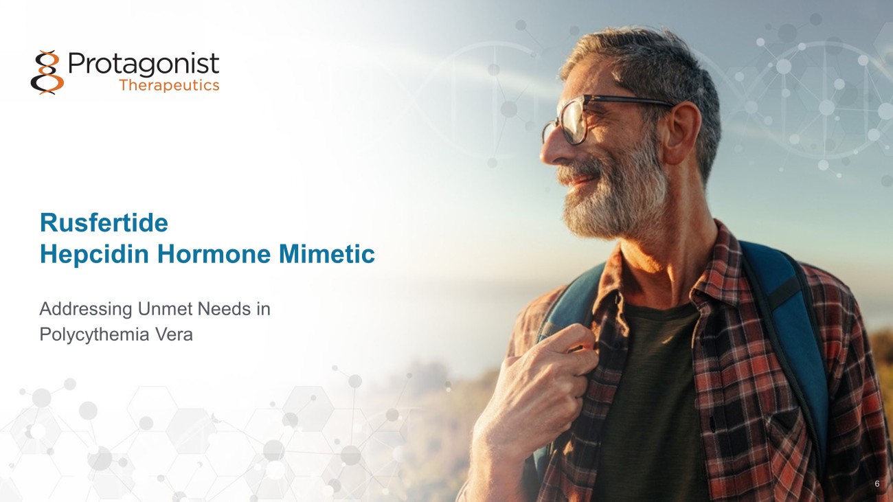 2023 2024​ 2025​ 2026​ Q4​ Q1​ Q2​ Q3​ Q4​ ​ ​ ​ ​ ​ ​ ​ ​ ​ ​ ​ ​ ​ ​ ​ ​ ​ ​ ​ ​ ​ ASH JNJ - 2113 Janssen Major Catalysts Ahead A Transformative Path Forward for Protagonist, from Discovery to Development to Commercialization Program Rusfertide in PV JNJ - 2113 Janssen Discovery & Pre - Clinical 5 VERIFY Ph3 Enrollment Completion EHA 2 - yr CARC completion VERIFY Ph3 32 wk 1 ° EP (Q1) NDA Filing (Q4) Product launch • Ph3 ICONIC - LEAD psoriasis • Ph3 ICONIC - TOTAL psoriasis • Ph2b ANTHEM UC • Ph3 ICONIC ADVANCE - 1 • Ph3 ICONIC ADVANCE - 2 Ph2b ANTHEM UC completion Anticipated NDA filing for psoriasis • Ph3 ICONIC - LEAD completion • Ph3 ICONIC - TOTAL completion I & I Hematology Oral IL - 17 Program Pre - clinical PoC • Oral IL - 17 Peptide Antagonist Development Candidate ASH