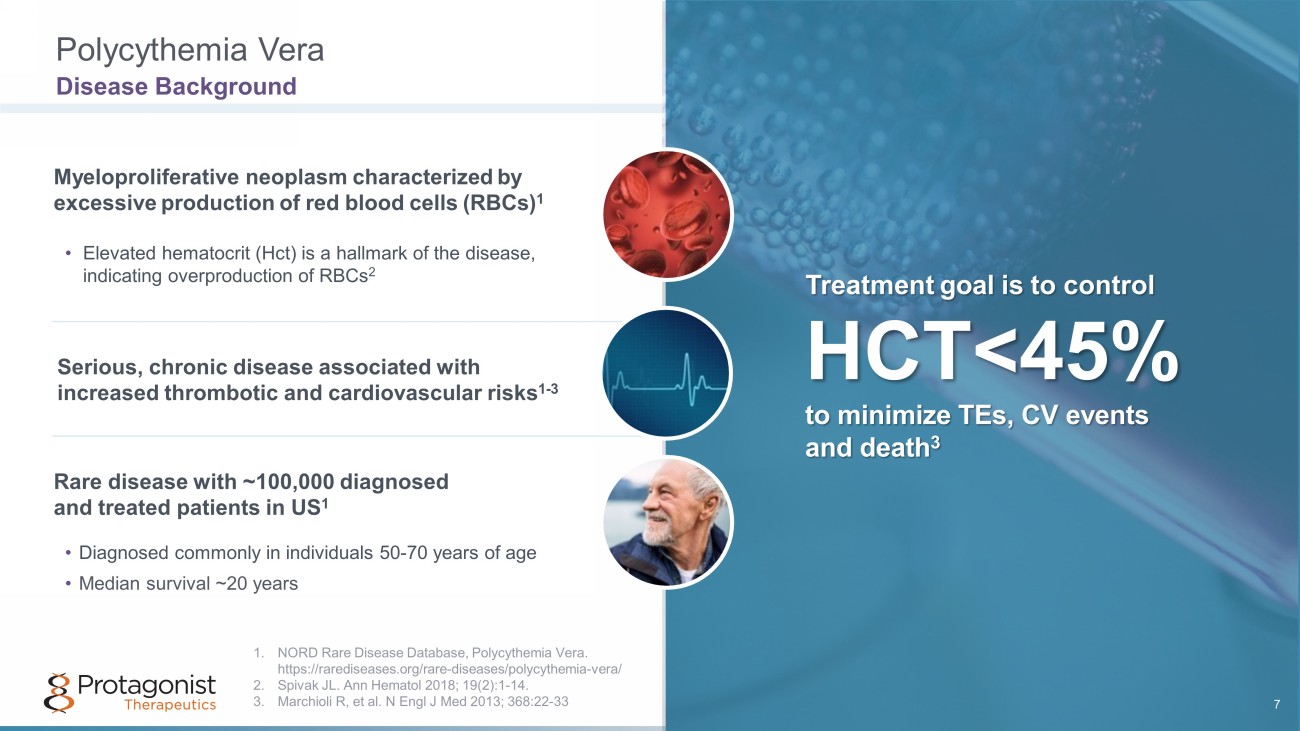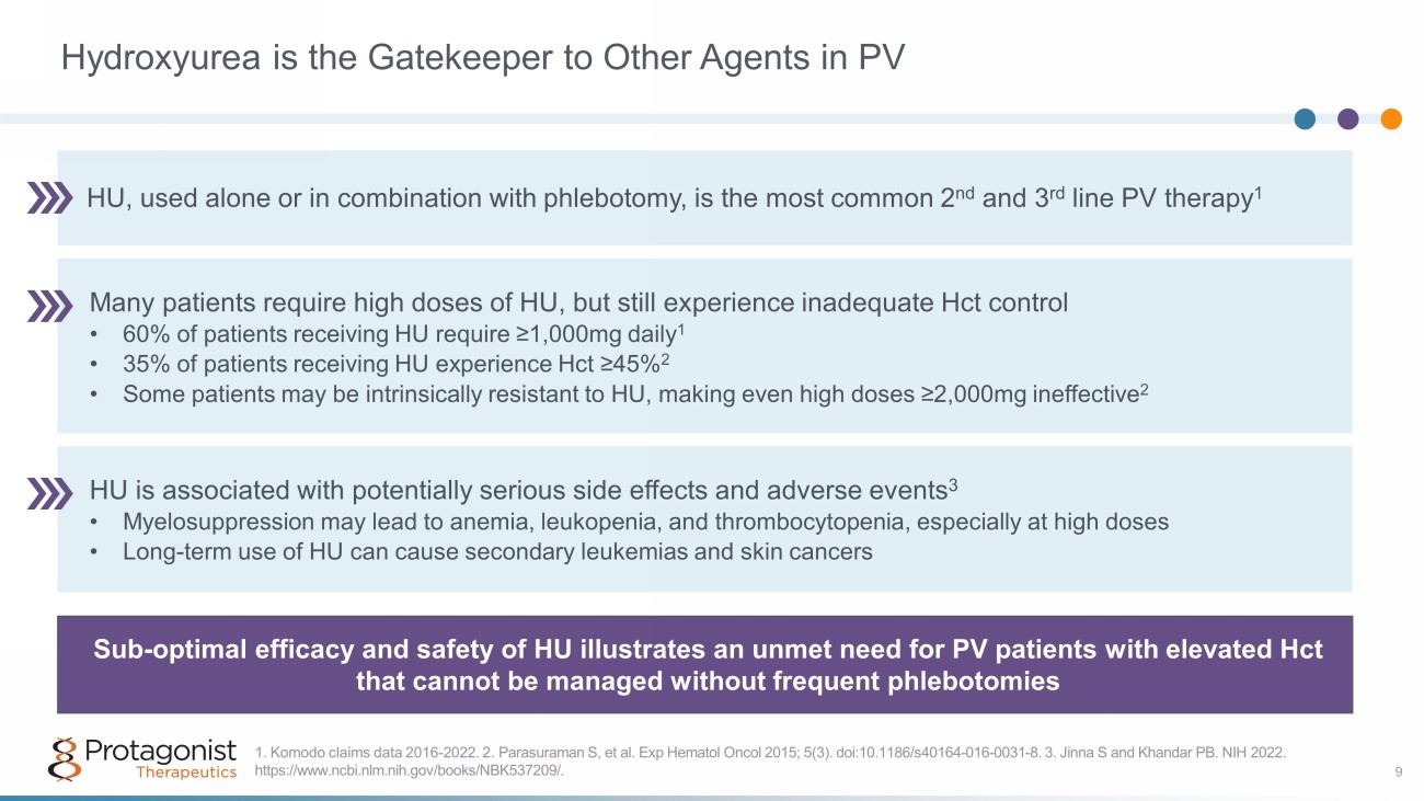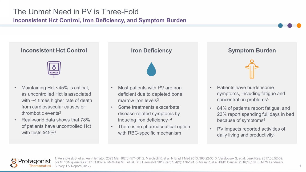 1. Verstovsek S, et al. Ann Hematol. 2023 Mar;102(3):571 - 581 2. Marchioli R, et al. N Engl J Med 2013; 368:22 - 33 3. Verstovsek S, et al. Leuk Res. 2017;56:52 - 59. doi:10.1016/j.leukres.2017.01.032. 4. McMullin MF, et. al. Br J Haematol. 2019 Jan; 184(2): 176 - 191. 5. Mesa R, et al. BMC Cancer. 2016;16,167. 6 . MPN Landmark Survey, PV Report (2017) . Inconsistent Hct Control • Maintaining Hct <45% is critical, as uncontrolled Hct is associated with ~4 times higher rate of death from cardiovascular causes or thrombotic events 2 • Real - world data shows that 78% of patients have uncontrolled Hct with tests ≥ 45% 1 Iron Deficiency • Most patients with PV are iron deficient due to depleted bone marrow iron levels 3 • Some treatments exacerbate disease - related symptoms by inducing iron deficiency 3,4 • There is no pharmaceutical option with RBC - specific mechanism Symptom Burden • Patients have burdensome symptoms, including fatigue and concentration problems 5 • 84% of patients report fatigue, and 23% report spending full days in bed because of symptoms 6 • PV impacts reported activities of daily living and productivity 5 The Unmet Need in PV is Three - Fold Inconsistent Hct Control, Iron Deficiency, and Symptom Burden 8