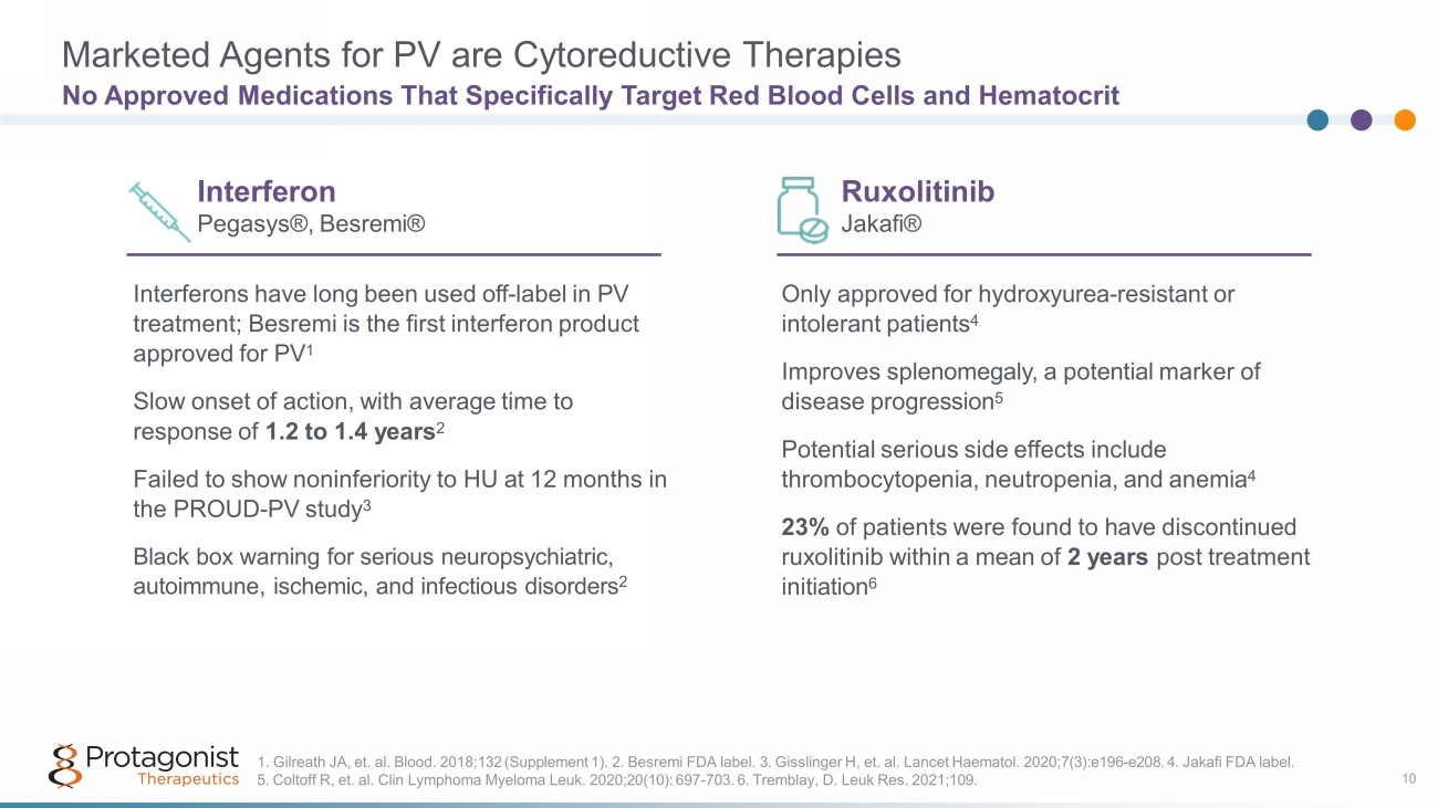 Hydroxyurea is the Gatekeeper to Other Agents in PV 9 HU, used alone or in combination with phlebotomy, is the most common 2 nd and 3 rd line PV therapy 1 Many patients require high doses of HU, but still experience inadequate Hct control • 60% of patients receiving HU require ≥ 1,000mg daily 1 • 35% of patients receiving HU experience Hct ≥ 45% 2 • Some patients may be intrinsically resistant to HU, making even high doses ≥ 2,000mg ineffective 2 Sub - optimal efficacy and safety of HU illustrates an unmet need for PV patients with elevated Hct that cannot be managed without frequent phlebotomies HU is associated with potentially serious side effects and adverse events 3 • Myelosuppression may lead to anemia, leukopenia, and thrombocytopenia, especially at high doses • Long - term use of HU can cause secondary leukemias and skin cancers 1. Komodo claims data 2016 - 2022. 2. Parasuraman S, et al. Exp Hematol Oncol 2015; 5(3). doi:10.1186/s40164 - 016 - 0031 - 8. 3. Jinna S and Khandar PB. NIH 2022. https://www.ncbi.nlm.nih.gov/books/NBK537209/.