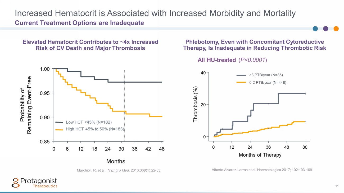 Interferon Pegasys ®, Besremi ® Interferons have long been used off - label in PV treatment; Besremi is the first interferon product approved for PV 1 Slow onset of action, with a verage time to response of 1.2 to 1.4 years 2 Failed to show noninferiority to HU at 12 months in the PROUD - PV study 3 Black box warning for serious neuropsychiatric, autoimmune, ischemic, and infectious disorders 2 Ruxolitinib Jakafi® Only approved for hydroxyurea - resistant or intolerant patients 4 Improves splenomegaly, a potential marker of disease progression 5 Potential serious side effects include thrombocytopenia, neutropenia, and anemia 4 23% of patients were found to have discontinued ruxolitinib within a mean of 2 years post treatment initiation 6 1. Gilreath JA, et. al. Blood. 2018;132 (Supplement 1). 2 . Besremi FDA label. 3 . Gisslinger H, et. al. Lancet Haematol . 2020;7(3):e196 - e208. 4 . Jakafi FDA label. 5 . Coltoff R, et. al. Clin Lymphoma Myeloma Leuk. 2020;20(10): 697 - 703. 6 . Tremblay, D. Leuk Res. 2021;109. Marketed Agents for PV are Cytoreductive Therapies 10 No Approved Medications That Specifically Target Red Blood Cells and Hematocrit