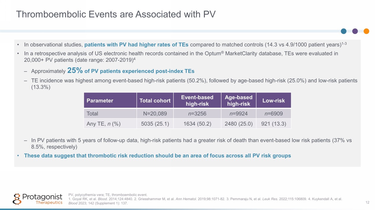 Thromboembolic Events are Associated with PV 12 • In observational studies, patients with PV had higher rates of TEs compared to matched controls (14.3 vs 4.9/1000 patient years) 1 - 3 • In a retrospective analysis of US electronic health records contained in the Optum ® MarketClarity database, TEs were evaluated in 20,000+ PV patients (date range: 2007 - 2019) 4 – Approximately 25% of PV patients experienced post - index TEs – TE incidence was highest among event - based high - risk patients (50.2%), followed by age - based high - risk (25.0%) and low - risk pati ents (13.3%) – In PV patients with 5 years of follow - up data, high - risk patients had a greater risk of death than event - based low risk patients (37% vs 8.5%, respectively) • These data suggest that thrombotic risk reduction should be an area of focus across all PV risk groups PV, polycythemia vera; TE, thromboembolic event. 1. Goyal RK, et al. Blood . 2014;124:4840. 2. Griesshammer M, et al. Ann Hematol . 2019;98:1071 - 82. 3. Pemmaraju N, et al. Leuk Res . 2022;115:106809. 4. Kuykendall A, et al. Blood 2023; 142 (Supplement 1): 137. Parameter Total cohort Event - based high - risk Age - based high - risk Low - risk Total N=20,089 n =3256 n =9924 n =6909 Any TE , n (%) 5035 (25.1) 1634 (50.2) 2480 (25.0) 921 (13.3)