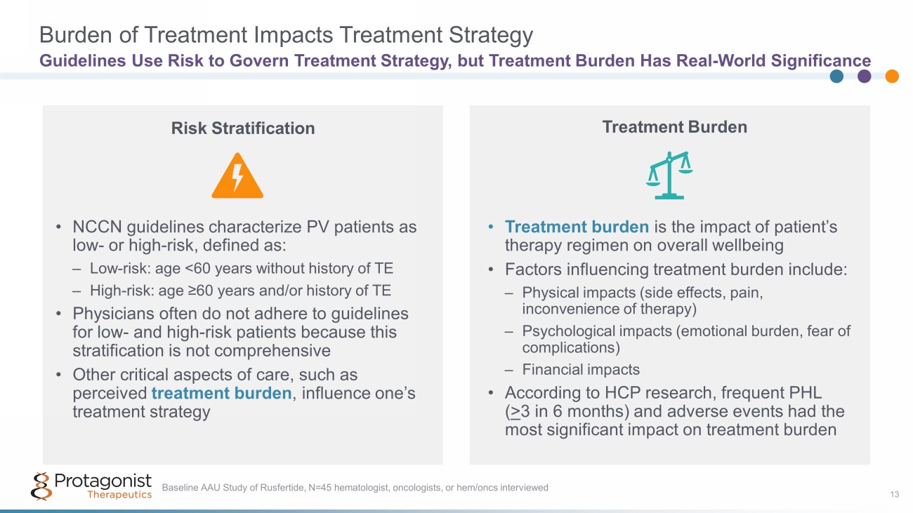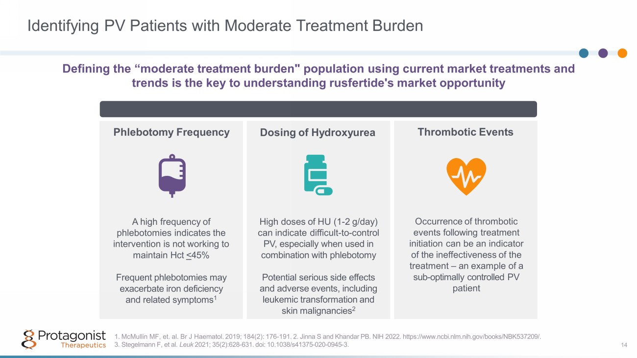 Burden of Treatment Impacts Treatment Strategy 13 Guidelines Use Risk to Govern Treatment Strategy, but Treatment Burden Has Real - World Significance Risk Stratification Treatment Burden • NCCN guidelines characterize PV patients as low - or high - risk, defined as: – Low - risk: age <60 years without history of TE – High - risk: age ≥60 years and/or history of TE • Physicians often do not adhere to guidelines for low - and high - risk patients because this stratification is not comprehensive • Other critical aspects of care, such as perceived treatment burden , influence one’s treatment strategy • Treatment burden is the impact of patient’s therapy regimen on overall wellbeing • Factors influencing treatment burden include: – Physical impacts (side effects, pain, inconvenience of therapy) – Psychological impacts (emotional burden, fear of complications) – Financial impacts • According to HCP research, frequent PHL ( > 3 in 6 months) and adverse events had the most significant impact on treatment burden Baseline AAU Study of Rusfertide, N=45 hematologist, oncologists, or hem/oncs interviewed