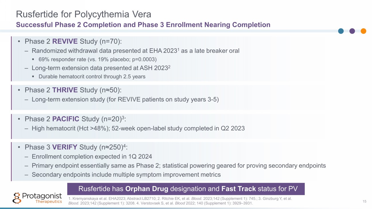 Defining the “moderate treatment burden " population using current market treatments and trends is the key to understanding rusfertide's market opportunity Phlebotomy Frequency Dosing of Hydroxyurea Thrombotic Events A high frequency of phlebotomies indicates the intervention is not working to maintain Hct < 45% Frequent phlebotomies may exacerbate iron deficiency and related symptoms 1 High doses of HU (1 - 2 g/day) can indicate difficult - to - control PV, especially when used in combination with phlebotomy Potential serious side effects and adverse events, including leukemic transformation and skin malignancies 2 Occurrence of thrombotic events following treatment initiation can be an indicator of the ineffectiveness of the treatment – a n example of a sub - optimally controlled PV patient 1. McMullin MF, et. al. Br J Haematol. 2019; 184(2): 176 - 191. 2 . Jinna S and Khandar PB. NIH 2022. https://www.ncbi.nlm.nih.gov/books/NBK537209/. 3. Stegelmann F, et al. Leuk 2021; 35(2):628 - 631. doi: 10.1038/s41375 - 020 - 0945 - 3. Identifying PV Patients with Moderate Treatment Burden 14