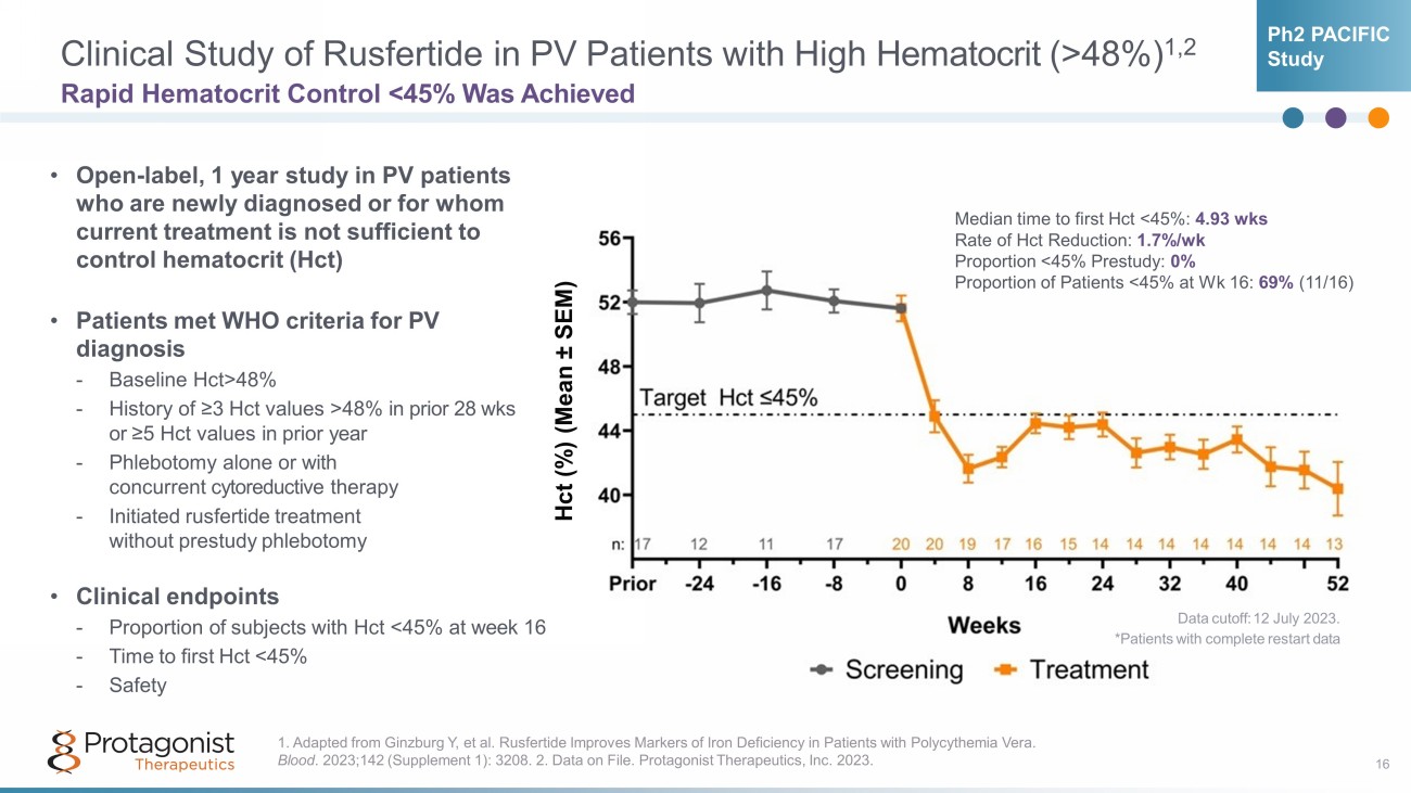 Rusfertide for Polycythemia Vera 15 Successful Phase 2 Completion and Phase 3 Enrollment Nearing Completion • Phase 2 REVIVE Study (n=70): – Randomized withdrawal data presented at EHA 2023 1 as a late breaker oral ▪ 69% responder rate (vs. 19% placebo; p=0.0003) – Long - term extension data presented at ASH 2023 2 ▪ Durable hematocrit control through 2.5 years Rusfertide has Orphan Drug designation and Fast Track status for PV • Phase 3 VERIFY Study (n≈250) 4 : – Enrollment completion expected in 1Q 2024 – Primary endpoint essentially same as Phase 2; statistical powering geared for proving secondary endpoints – Secondary endpoints include multiple symptom improvement metrics • Phase 2 PACIFIC Study (n=20) 3 : – High hematocrit (Hct >48%); 52 - week open - label study completed in Q2 2023 • Phase 2 THRIVE Study (n≈50): – Long - term extension study (for REVIVE patients on study years 3 - 5) 1. Kremyanskaya et al. EHA2023; Abstract LB2710; 2. Ritchie EK, et al. Blood . 2023;142 (Supplement 1): 745.; 3. Ginzburg Y, et al. Blood . 2023;142 (Supplement 1): 3208. 4. Verstovsek S, et al. Blood 2022; 140 (Supplement 1): 3929 – 3931.