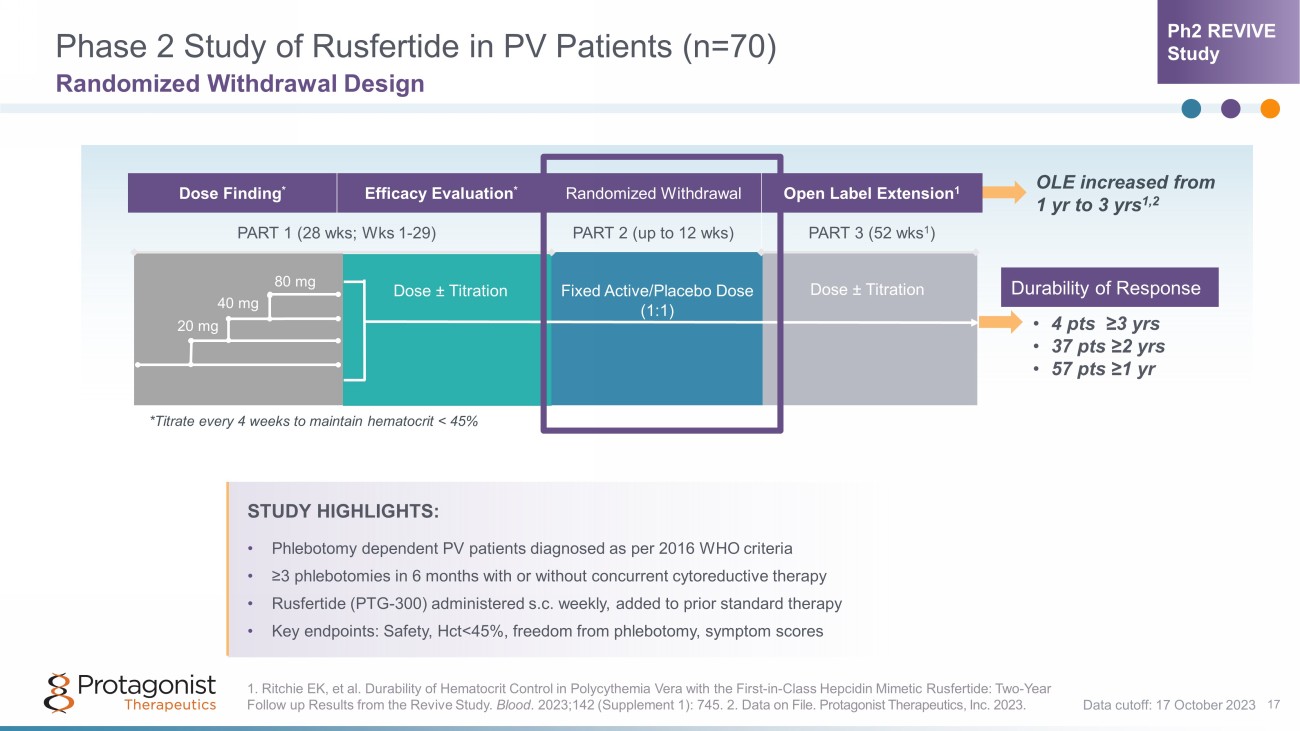 Clinical Study of Rusfertide in PV Patients with High Hematocrit (>48%) 1,2 16 Rapid Hematocrit Control <45% Was Achieved • Open - label, 1 year study in PV patients who are newly diagnosed or for whom current treatment is not sufficient to control hematocrit ( Hct ) • Patients met WHO criteria for PV diagnosis - Baseline Hct>48% - History of ≥3 Hct values >48% in prior 28 wks or ≥5 Hct values in prior year - Phlebotomy alone or with concurrent cytoreductive therapy - Initiated rusfertide treatment without prestudy phlebotomy • Clinical endpoints - P roportion of subjects with Hct <45% at week 16 - Time to first Hct <45% - Safety Data cutoff: 12 July 2023. *Patients with complete restart data Median time to first Hct <45%: 4.93 wks Rate of Hct Reduction: 1.7%/wk Proportion <45% Prestudy: 0% Proportion of Patients <45% at Wk 16: 69% (11/16) 1. Adapted from Ginzburg Y, et al. Rusfertide Improves Markers of Iron Deficiency in Patients with Polycythemia Vera. Blood . 2023;142 (Supplement 1): 3208. 2. Data on File. Protagonist Therapeutics, Inc. 2023. Hct (%) (Mean ± SEM) Ph2 PACIFIC Study