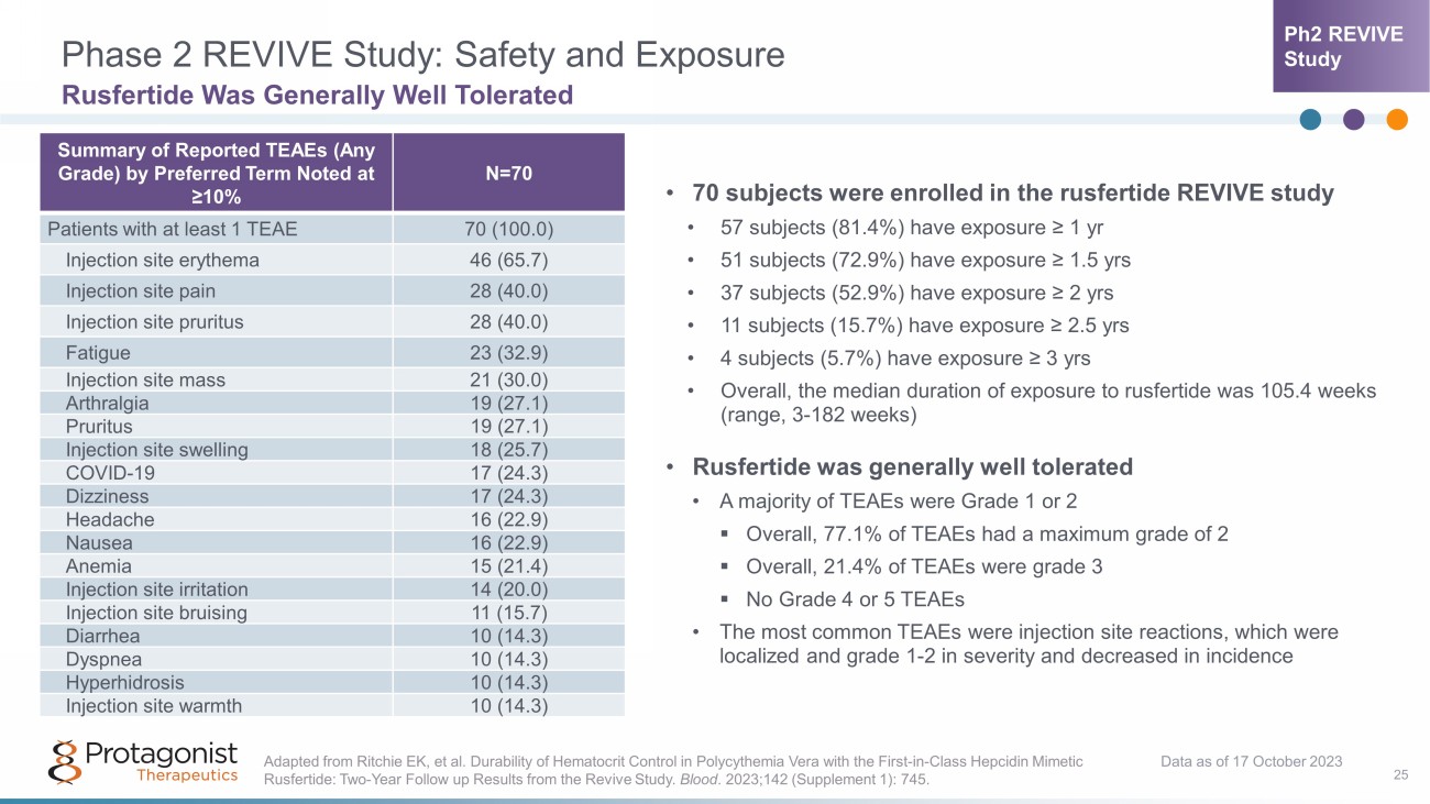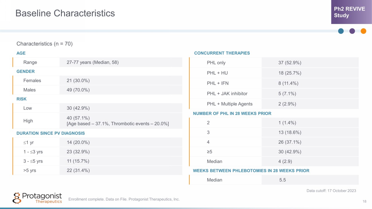 Dose Finding * Efficacy Evaluation * Randomized Withdrawal Open Label Extension 1 PART 1 (28 wks; Wks 1 - 29) PART 2 (up to 12 wks) PART 3 (52 wks 1 ) STUDY HIGHLIGHTS: • Phlebotomy dependent PV patients diagnosed as per 2016 WHO criteria • ≥3 phlebotomies in 6 months with or without concurrent cytoreductive therapy • Rusfertide (PTG - 300) administered s.c. weekly, added to prior standard therapy • Key endpoints: Safety, Hct<45%, freedom from phlebotomy, symptom scores Dose ± Titration Fixed Active/Placebo Dose (1:1) Dose ± Titration *Titrate every 4 weeks to maintain hematocrit < 45% 20 mg 40 mg 80 mg OLE increased from 1 yr to 3 yrs 1,2 • 4 pts ≥3 yrs • 37 pts ≥2 yrs • 57 pts ≥1 yr 1. Ritchie EK, et al. Durability of Hematocrit Control in Polycythemia Vera with the First - in - Class Hepcidin Mimetic Rusfertide: T wo - Year Follow up Results from the Revive Study. Blood . 2023;142 (Supplement 1): 745. 2. Data on File. Protagonist Therapeutics, Inc. 2023. Phase 2 Study of Rusfertide in PV Patients (n=70) Randomized Withdrawal Design 17 Data cutoff: 17 October 2023 Durability of Response Ph2 REVIVE Study