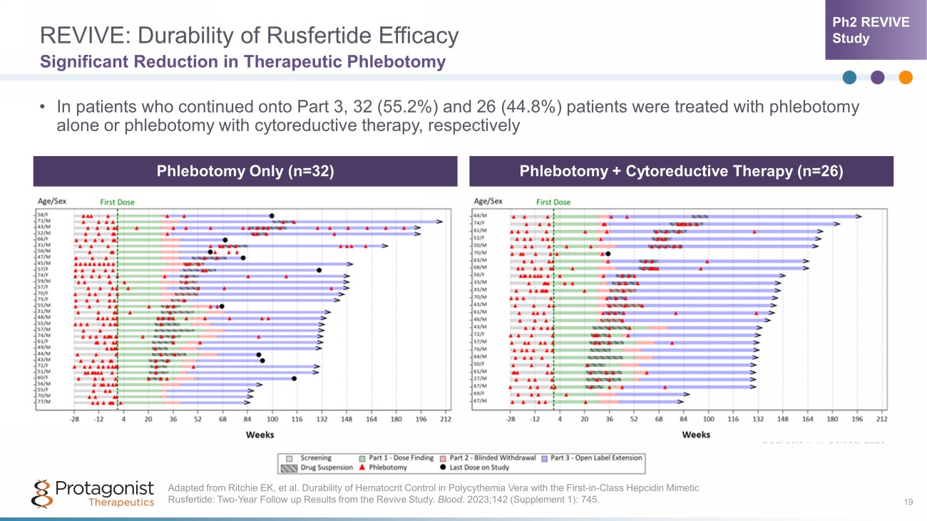 Baseline Characteristics Characteristics (n = 70) AGE Range 27 - 77 years (Median, 58) GENDER Females 21 (30.0%) Males 49 (70.0%) RISK Low 30 (42.9%) High 40 (57.1%) [Age based – 37.1%, Thrombotic events – 20.0%] DURATION SINCE PV DIAGNOSIS 1 yr 14 (20.0%) 1 - 3 yrs 23 (32.9%) 3 - 5 yrs 11 (15.7%) >5 yrs 22 (31.4%) Enrollment complete. Data on File. Protagonist Therapeutics, Inc. CONCURRENT THERAPIES PHL only 37 (52.9%) PHL + HU 18 (25.7%) PHL + IFN 8 (11.4%) PHL + JAK inhibitor 5 (7.1%) PHL + Multiple Agents 2 (2.9%) NUMBER OF PHL IN 28 WEEKS PRIOR 2 1 (1.4%) 3 13 (18.6%) 4 26 (37.1%) ≥5 30 (42.9%) Median 4 (2.9) WEEKS BETWEEN PHLEBOTOMIES IN 28 WEEKS PRIOR Median 5.5 18 Data cutoff: 17 October 2023 Ph2 REVIVE Study