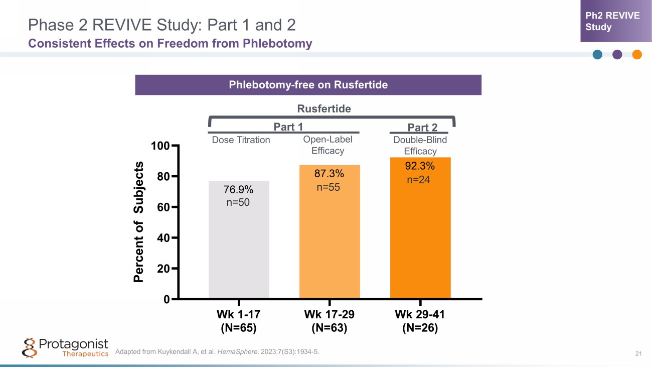Part 2: Blinded Randomized Withdrawal, Weeks 29 - 41 20 Rusfertide Met the Primary Endpoint of Efficacy (p=0.0003) • 69.2% subjects (18 out of 26) are responders. 8 non - responders as per protocol definition - 3 fulfilled the phlebotomy eligibility criteria - 5 discontinued treatment per patient/investigator discretion • All 8 non - responders continued in the Part 3 open label extension part of the study - 7 out of 8 are currently continuing treatment • 92.3% subjects (24 out of 26) in rusfertide arm did not receive phlebotomy in Part 2, the 12 - week randomization part of the study Placebo (N=27) Rusfertide (N=26) 0 10 20 30 40 50 60 70 80 69.2% 18.5% P e r c e n t o f R e s p o n d e r s p=0.0003 n=5 n=18 *Responder definition as per protocol • Did not receive a phlebotomy • Completed 12 weeks of treatment • Hematocrit control maintained without phlebotomy eligibility, which is defined as - Hematocrit ≥45% that was ≥3% higher than Week 29 pre - randomization hematocrit value or - Hematocrit >48% or - An increase of ≥5% in hematocrit compared to Week 29 pre - randomization hematocrit value Highly Significant Efficacy* in Rusfertide Arm vs. Placebo Adapted from Kremyanskaya et al. EHA2023; Abstract LB2710. Ph2 REVIVE Study