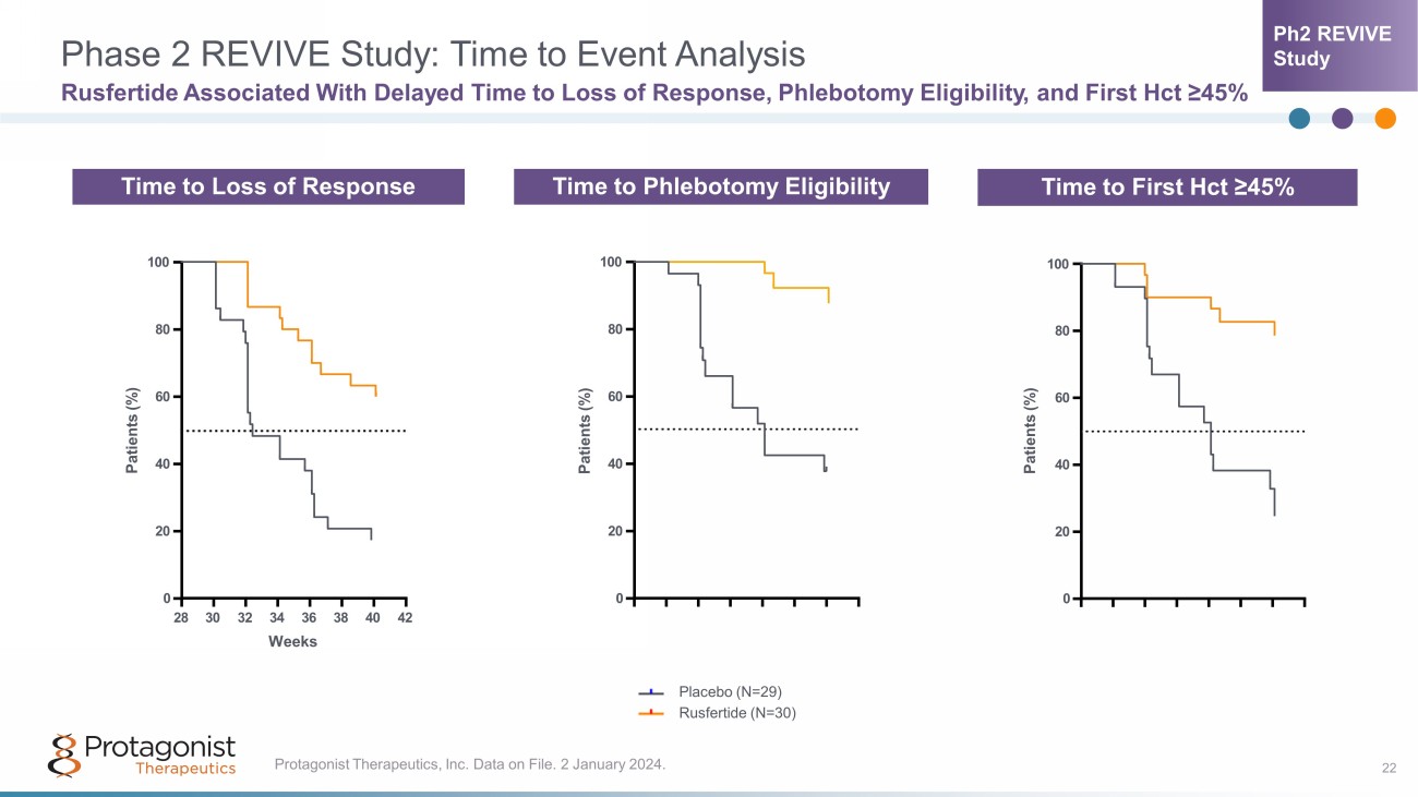Phase 2 REVIVE Study: Part 1 and 2 21 Consistent Effects on Freedom from Phlebotomy Wk 1-17 (N=65) Wk 17-29 (N=63) Wk 29-41 (N=26) 0 20 40 60 80 100 92.3% 87.3% 76.9% P e r c e n t o f S u b j e c t s n=24 n=50 n=55 Part 1 Part 2 Phlebotomy - free on Rusfertide Rusfertide Dose Titration Open - Label Efficacy Double - Blind Efficacy Adapted from Kuykendall A, et al. HemaSphere. 2023;7(S3):1934 - 5. Ph2 REVIVE Study