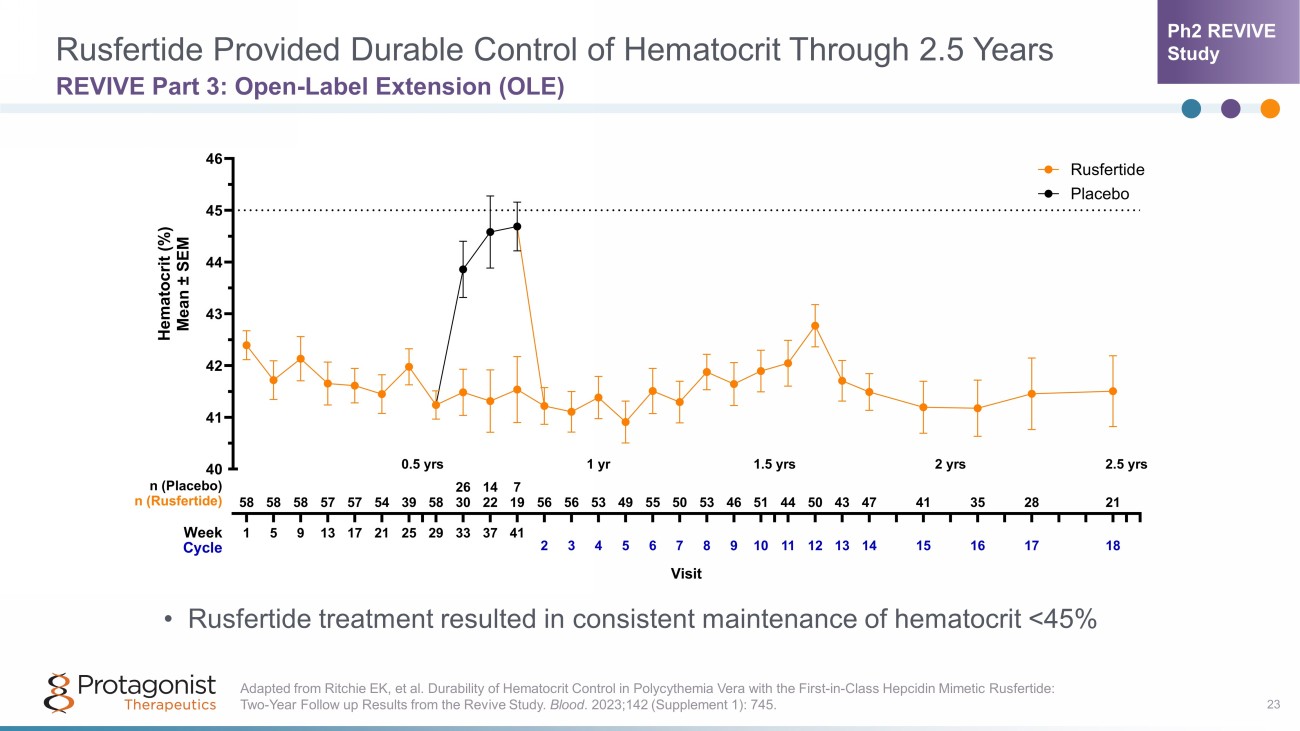 Phase 2 REVIVE Study: Time to Event Analysis 22 Rusfertide Associated W ith D elayed T ime to Loss of Response, Phlebotomy E ligibility, and First Hct ≥45% Protagonist Therapeutics, Inc. Data on File. 2 January 2024. Time to Phlebotomy Eligibility 0 20 40 60 80 100 Time to Loss of Response 0 20 40 60 80 100 28 30 32 34 36 38 40 42 Weeks Patients (%) Time to First Hct ≥45% 100 0 20 40 60 80 Patients (%) Patients (%) Placebo (N=29) Rusfertide (N=30) Ph2 REVIVE Study