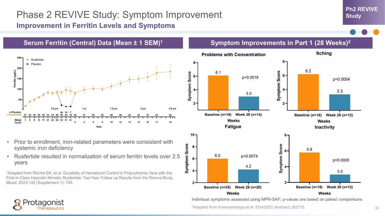Rusfertide Provided Durable Control of Hematocrit Through 2.5 Years 23 REVIVE Part 3: Open - Label Extension (OLE) • Rusfertide treatment resulted in consistent maintenance of hematocrit <45% Adapte d from Ritchie EK, et al. Durability of Hematocrit Control in Polycythemia Vera with the First - in - Class Hepcidin Mimetic Rusfertide: Two - Year Follow up Results from the Revive Study. Blood . 2023;142 (Supplement 1): 745. Ph2 REVIVE Study