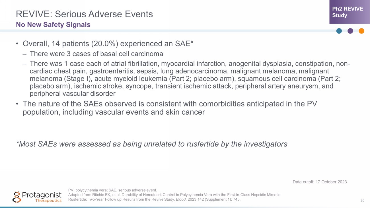 Phase 2 REVIVE Study: Safety and Exposure 25 Rusfertide Was Generally Well Tolerated • 70 subjects were enrolled in the rusfertide REVIVE study • 57 subjects (81.4%) have exposure ≥ 1 yr • 51 subjects (72.9%) have exposure ≥ 1.5 yrs • 37 subjects (52.9%) have exposure ≥ 2 yrs • 11 subjects (15.7%) have exposure ≥ 2.5 yrs • 4 subjects (5.7%) have exposure ≥ 3 yrs • Overall, the median duration of exposure to rusfertide was 105.4 weeks (range, 3 - 182 weeks) • Rusfertide was generally well tolerated • A majority of TEAEs were Grade 1 or 2 ▪ Overall, 77.1% of TEAEs had a maximum grade of 2 ▪ Overall, 21.4% of TEAEs were grade 3 ▪ No Grade 4 or 5 TEAEs • The most common TEAEs were injection site reactions, which were localized and grade 1 - 2 in severity and decreased in incidence Summary of Reported TEAEs (Any Grade) by Preferred Term Noted at ≥10% N=70 Patients with at least 1 TEAE 70 (100.0) Injection site erythema 46 (65.7) Injection site pain 28 (40.0) Injection site pruritus 28 (40.0) Fatigue 23 (32.9) Injection site mass 21 (30.0) Arthralgia 19 (27.1) Pruritus 19 (27.1) Injection site swelling 18 (25.7) COVID - 19 17 (24.3) Dizziness 17 (24.3) Headache 16 (22.9) Nausea 16 (22.9) Anemia 15 (21.4) Injection site irritation 14 (20.0) Injection site bruising 11 (15.7) Diarrhea 10 (14.3) Dyspnea 10 (14.3) Hyperhidrosis 10 (14.3) Injection site warmth 10 (14.3) Data as of 17 October 2023 Adapte d from Ritchie EK, et al. Durability of Hematocrit Control in Polycythemia Vera with the First - in - Class Hepcidin Mimetic Rusfertide: Two - Year Follow up Results from the Revive Study. Blood . 2023;142 (Supplement 1): 745. Ph2 REVIVE Study
