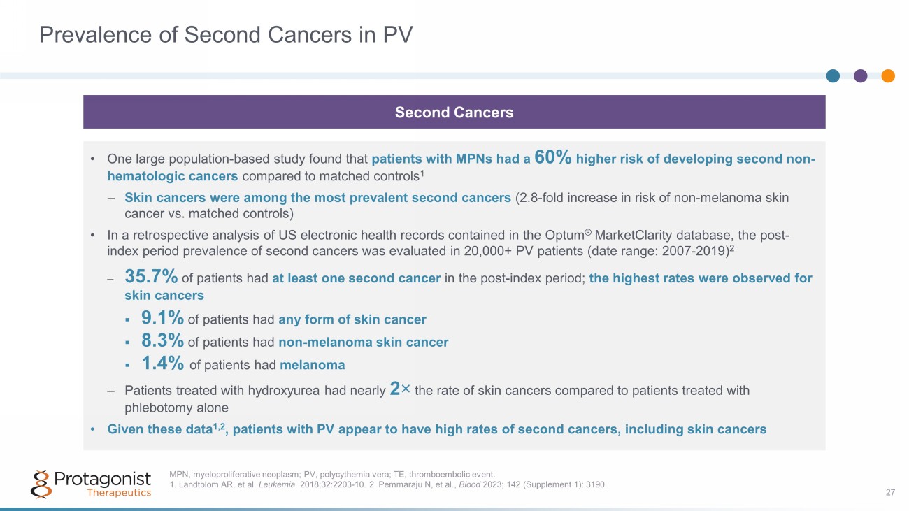 Prevalence of Second Cancers in PV 27 Second Cancers • One large population - based study found that patients with MPNs had a 60% higher risk of developing second non - hematologic cancers compared to matched controls 1 ‒ Skin cancers were among the most prevalent second cancers (2.8 - fold increase in risk of non - melanoma skin cancer vs. matched controls) • In a retrospective analysis of US electronic health records contained in the Optum ® MarketClarity database, the post - index period prevalence of second cancers was evaluated in 20,000+ PV patients (date range: 2007 - 2019) 2 – 35.7% of patients had at least one second cancer in the post - index period; the highest rates were observed for skin cancers ▪ 9.1% of patients had any form of skin cancer ▪ 8.3% of patients had non - melanoma skin cancer ▪ 1 .4% of patients had melanoma – Patients treated with hydroxyurea had nearly 2 × the rate of skin cancers compared to patients treated with phlebotomy alone • Given these data 1,2 , patients with PV appear to have high rates of second cancers, including skin cancers MPN, myeloproliferative neoplasm; PV, polycythemia vera; TE, thromboembolic event. 1. Landtblom AR, et al. Leukemia . 2018;32:2203 - 10. 2. Pemmaraju N, et al., Blood 2023; 142 (Supplement 1): 3190.