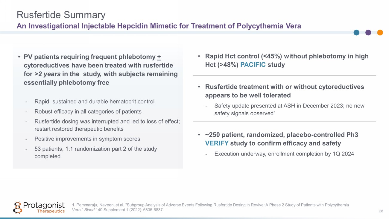 REVIVE: Serious Adverse Events 26 • Overall, 14 patients (20.0%) experienced an SAE* – There were 3 cases of basal cell carcinoma – There was 1 case each of atrial fibrillation, myocardial infarction, anogenital dysplasia, constipation, non - cardiac chest pain, gastroenteritis, sepsis, lung adenocarcinoma, malignant melanoma, malignant melanoma (Stage I), acute myeloid leukemia (Part 2; placebo arm), squamous cell carcinoma (Part 2; placebo arm), ischemic stroke, syncope, transient ischemic attack, peripheral artery aneurysm, and peripheral vascular disorder • The nature of the SAEs observed is consistent with comorbidities anticipated in the PV population, including vascular events and skin cancer *Most SAEs were assessed as being unrelated to rusfertide by the investigators No New Safety Signals Data cutoff: 17 October 2023 Ph2 REVIVE Study PV, polycythemia vera; SAE, serious adverse event. Adapte d from Ritchie EK, et al. Durability of Hematocrit Control in Polycythemia Vera with the First - in - Class Hepcidin Mimetic Rusfertide: Two - Year Follow up Results from the Revive Study. Blood . 2023;142 (Supplement 1): 745.