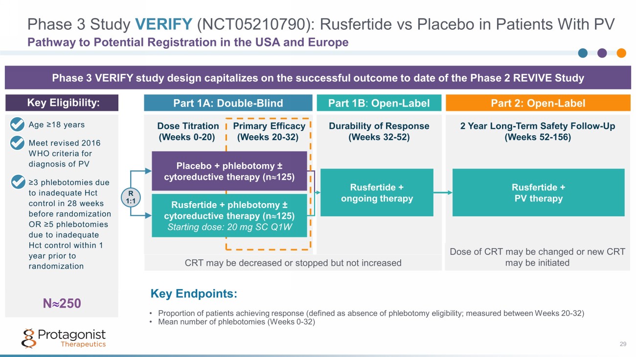 • Rapid Hct control (<45%) without phlebotomy in high Hct (>48%) PACIFIC study • Rusfertide treatment with or without cytoreductives appears to be well tolerated - Safety update presented at ASH in December 2023; no new safety signals observed 1 • ~250 patient, randomized, placebo - controlled Ph3 VERIFY study to confirm efficacy and safety - Execution underway, enrollment completion by 1Q 2024 Rusfertide Summary 28 An Investigational Injectable Hepcidin Mimetic for Treatment of Polycythemia Vera • PV patients requiring frequent phlebotomy + cytoreductives have been treated with rusfertide for >2 years in the study, with subjects remaining essentially phlebotomy free - Rapid, sustained and durable hematocrit control - Robust efficacy in all categories of patients - Rusfertide dosing was interrupted and led to loss of effect; restart restored therapeutic benefits - Positive improvements in symptom scores - 53 patients, 1:1 randomization part 2 of the study completed 1. Pemmaraju, Naveen, et al. "Subgroup Analysis of Adverse Events Following Rusfertide Dosing in Revive: A Phase 2 Study of Pati ent s with Polycythemia Vera." Blood 140.Supplement 1 (2022): 6835 - 6837.