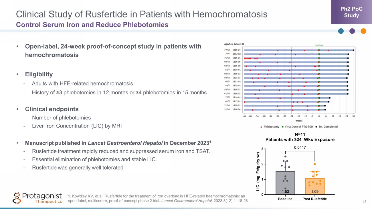 Clinical Study of Rusfertide in Patients with Hemochromatosis 31 Control Serum Iron and Reduce Phlebotomies • Open - label, 24 - week proof - of - concept study in patients with hemochromatosis • Eligibility - Adults with HFE - related hemochromatosis. - History of ≥3 phlebotomies in 12 months or ≥4 phlebotomies in 15 months • Clinical endpoints - Number of phlebotomies - Liver Iron Concentration (LIC) by MRI • Manuscript published in Lancet Gastroenterol Hepatol in December 2023 1 - Rusfertide treatment rapidly reduced and suppressed serum iron and TSAT. - Essential elimination of phlebotomies and stable LIC. - Rusfertide was generally well tolerated Ph2 PoC Study 1. Kowdley KV, et al. Rusfertide for the treatment of iron overload in HFE - related haemochromatosis: an open - label, multicentre, proof - of - concept phase 2 trial. Lancet Gastroenterol Hepatol . 2023;8(12):1118 - 28.