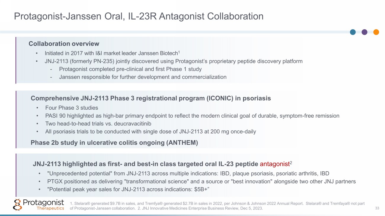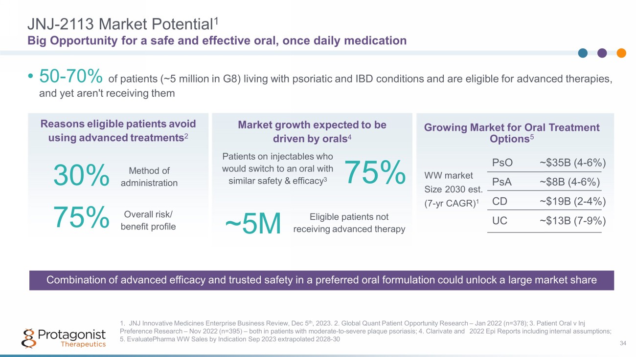 Protagonist - Janssen Oral, IL - 23R Antagonist Collaboration 33 JNJ - 2113 highlighted as f irst - and best - in class targeted oral IL - 23 peptide antagonist 2 • "Unprecedented potential" from JNJ - 2113 across multiple indications: IBD, plaque psoriasis, psoriatic arthritis, IBD • PTGX positioned as delivering "transformational science" and a source or "best innovation" alongside two other JNJ partners • "Potential peak year sales for JNJ - 2113 across indications: $5B+” Collaboration overview • Initiated in 2017 with I&I market leader Janssen Biotech 1 • JNJ - 2113 (formerly PN - 235) jointly discovered using Protagonist’s proprietary peptide discovery platform - Protagonist completed pre - clinical and first Phase 1 study - Janssen responsible for further development and commercialization Comprehensive JNJ - 2113 Phase 3 registrational program (ICONIC) in psoriasis • Four Phase 3 studies • PASI 90 highlighted as high - bar primary endpoint to reflect the modern clinical goal of durable, symptom - free remission • Two head - to - head trials vs. deucravacitinib • All psoriasis trials to be conducted with single dose of JNJ - 2113 at 200 mg once - daily Phase 2b study in ulcerative colitis ongoing (ANTHEM) 1. Stelara® generated $9.7B in sales, and Tremfya® generated $2.7B in sales in 2022, per Johnson & Johnson 2022 Annual Report. Ste lara® and Tremfaya® not part of Protagonist - Janssen collaboration. 2. JNJ Innovative Medicines Enterprise Business Review, Dec 5, 2023.