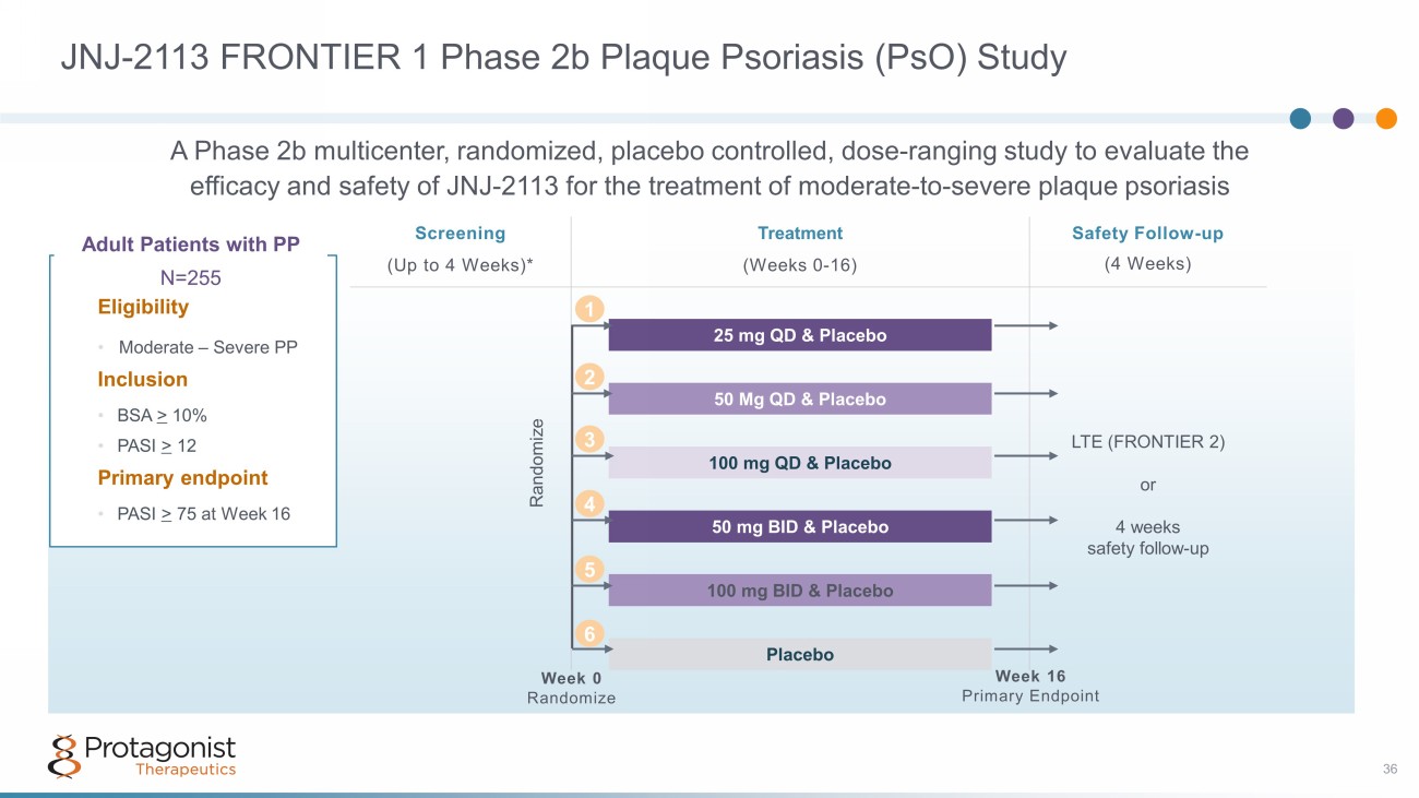 JNJ - 2113: Oral, IL - 23R Peptide Antagonist 35 Preclinical, Phase 1 and Phase 2b Data Supportive of a Robust Clinical Development Program 1 1. ISID – Fourie A, et al. First - in - Class Oral Peptide Systemically Targeting the IL - 23 Pathway. Abstract presented at the Inter national Societies for Investigative Dermatology; May 2023 WCD – Bissonnette R, et al. A Phase 2, Randomized, Placebo - controlled, Dose Ranging Study of Oral JNJ - 77242113 for the Treatment of Moderate - to - Severe Plaque Psoriasis: FRONTIER 1. Late Breaking Abstract presented at the World Congress of Dermatology; July 2023 • >24hr half - life in feces (human, cyno, and rat) • >25% fecal recovery after 24hrs in cynos • Rat ear skin inflammation model • Rat TNBS colitis model Pre - clinical Proof - of - Concept High O ral Stability Highly Potent O ral IL - 23R A ntagonist • Picomolar potency Similar or better target affinity vs. IL - 23 mAbs Phase 1 studies in NHVs Phase 2b FRONTIER1 study in Psoriasis • PD based PoC: Inhibition of IL - 23 biomarkers • Potential for best - in - class oral agent for psoriasis Protagonist – JNJ Innovative Medicines Discovery & Development Partnership