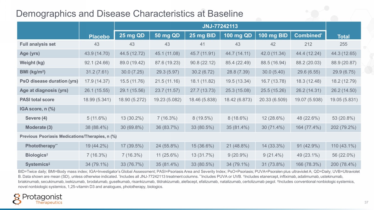 Demographics and Disease Characteristics at Baseline BID=Twice daily; BMI=Body mass index; IGA=Investigator’s Global Assessment; PASI=Psoriasis Area and Severity Index; PsO=Psoriasis; PUVA=Psoralen plus ultraviolet A; QD=Daily; UVB=Ultraviolet B. Data shown are mean (SD), unless otherwise indicated. * Includes all JNJ - 77242113 treatment columns. ** Includes PUVA or UVB. † Includes etanercept, infliximab, adalimumab, ustekinumab, briakinumab, secukinumab, ixekizumab, brodalumab, guselkumab, risankizumab, tildrakizumab, alefacept, efalizumab, natalizumab, certolizumab pegol. ‡ Includes conventional nonbiologic systemics, novel nonbiologic systemics, 1,25 - vitamin D3 and analogues, phototherapy, biologics. Placebo JNJ - 77242113 Total 25 mg QD 50 mg QD 25 mg BID 100 mg QD 100 mg BID Combined * Full analysis set 43 43 43 41 43 42 212 255 Age (yrs) 43.9 (14.70) 44.5 (12.72) 45.1 (11.08) 45.7 (11.91) 44.7 (14.11) 42.0 (11.34) 44.4 (12.24) 44.3 (12.65) Weight (kg) 92.1 (24.66) 89.0 (19.42) 87.6 (19.23) 90.8 (22.12) 85.4 (22.49) 88.5 (16.94) 88.2 (20.03) 88.9 (20.87) BMI (kg/m 2 ) 31.2 (7.61) 30.0 (7.25) 29.3 (5.97) 30.2 (6.72) 28.8 (7.39) 30.0 (5.40) 29.6 (6.55) 29.9 (6.75) PsO disease duration (yrs) 17.9 (14.37) 15.5 (11.76) 21.5 (11.16) 18.1 (11.82) 19.5 (13.34) 16.7 (13.78) 18.3 (12.48) 18.2 (12.79) Age at diagnosis (yrs) 26.1 (15.55) 29.1 (15.56) 23.7 (11.57) 27.7 (13.73) 25.3 (15.08) 25.5 (15.26) 26.2 (14.31) 26.2 (14.50) PASI total score 18.99 (5.341) 18.90 (5.272) 19.23 (5.082) 18.46 (5.838) 18.42 (6.873) 20.33 (6.509) 19.07 (5.938) 19.05 (5.831) IGA score, n (%) Severe (4) 5 (11.6%) 13 (30.2%) 7 (16.3%) 8 (19.5%) 8 (18.6%) 12 (28.6%) 48 (22.6%) 53 (20.8%) Moderate (3) 38 (88.4%) 30 (69.8%) 36 (83.7%) 33 (80.5%) 35 (81.4%) 30 (71.4%) 164 (77.4%) 202 (79.2%) Previous Psoriasis Medications/Therapies, n (%) Phototherapy ** 19 (44.2%) 17 (39.5%) 24 (55.8%) 15 (36.6%) 21 (48.8%) 14 (33.3%) 91 (42.9%) 110 (43.1%) Biologics † 7 (16.3%) 7 (16.3%) 11 (25.6%) 13 (31.7%) 9 (20.9%) 9 (21.4%) 49 (23.1%) 56 (22.0%) Systemics ‡ 34 (79.1%) 33 (76.7%) 35 (81.4%) 33 (80.5%) 34 (79.1%) 31 (73.8%) 166 (78.3%) 200 (78.4%) 37