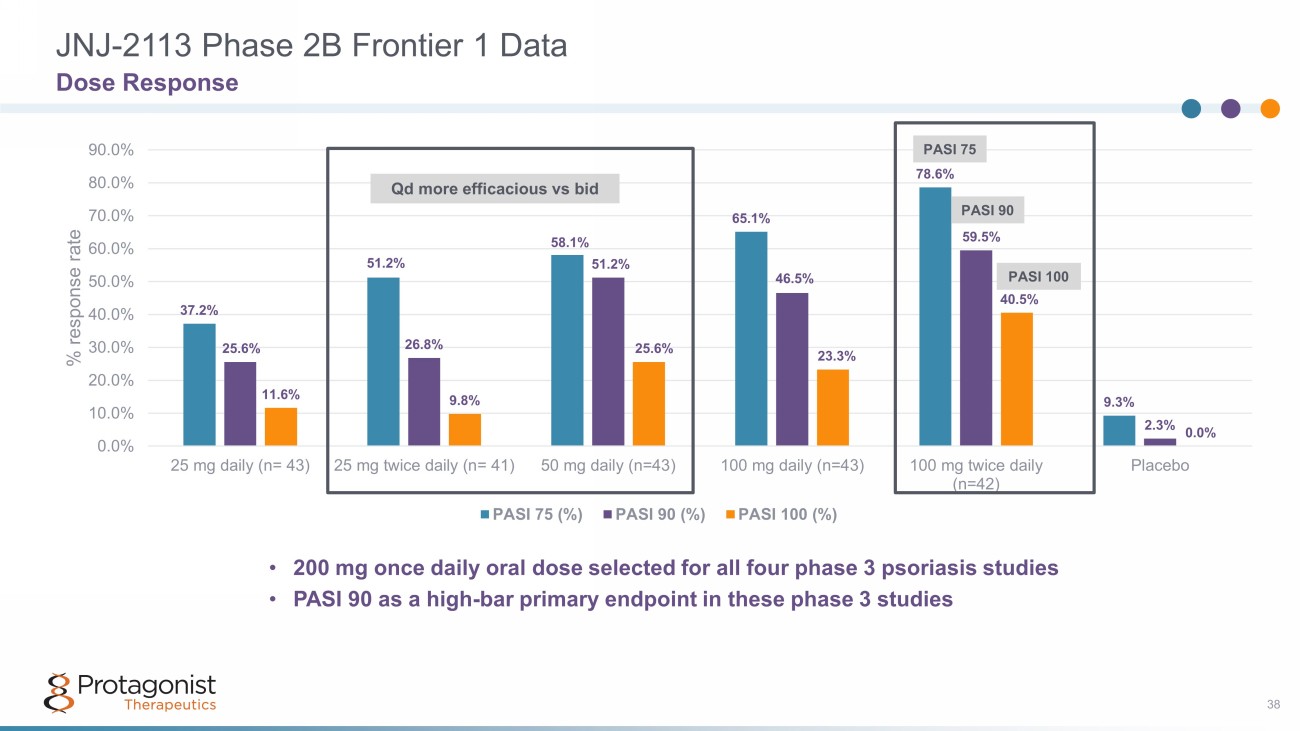 JNJ - 2113 FRONTIER 1 Phase 2b Plaque Psoriasis (PsO) Study 36 Adult Patients with PP N=255 Eligibility • Moderate – Severe PP Inclusion • BSA > 10% • PASI > 12 Primary endpoint • PASI > 75 at Week 16 Screening Treatment Safety Follow - up (4 Weeks) (Up to 4 Weeks)* (Weeks 0 - 16) 25 mg QD & Placebo LTE (FRONTIER 2) or 4 weeks safety follow - up 50 Mg QD & Placebo 100 mg QD & Placebo 50 mg BID & Placebo 100 mg BID & Placebo Placebo Week 0 Randomize Week 16 Primary Endpoint Randomize 2 1 3 4 5 6 A Phase 2b multicenter, randomized, placebo controlled, dose - ranging study to evaluate the efficacy and safety of JNJ - 2113 for the treatment of moderate - to - severe plaque psoriasis