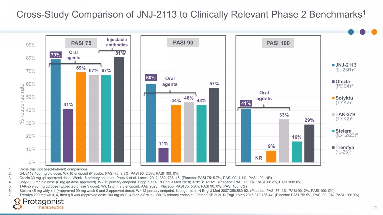 JNJ - 2113 Phase 2B Frontier 1 Data 37.2% 51.2% 58.1% 65.1% 78.6% 9.3% 25.6% 26.8% 51.2% 46.5% 59.5% 2.3% 11.6% 9.8% 25.6% 23.3% 40.5% 0.0% 0.0% 10.0% 20.0% 30.0% 40.0% 50.0% 60.0% 70.0% 80.0% 90.0% 25 mg daily (n= 43) 25 mg twice daily (n= 41) 50 mg daily (n=43) 100 mg daily (n=43) 100 mg twice daily (n=42) Placebo % response rate PASI 75 (%) PASI 90 (%) PASI 100 (%) Dose Response • 200 mg once daily oral dose selected for all four phase 3 psoriasis studies • PASI 90 as a high - bar primary endpoint in these phase 3 studies 38 PASI 90 PASI 75 PASI 100 Qd more efficacious vs bid