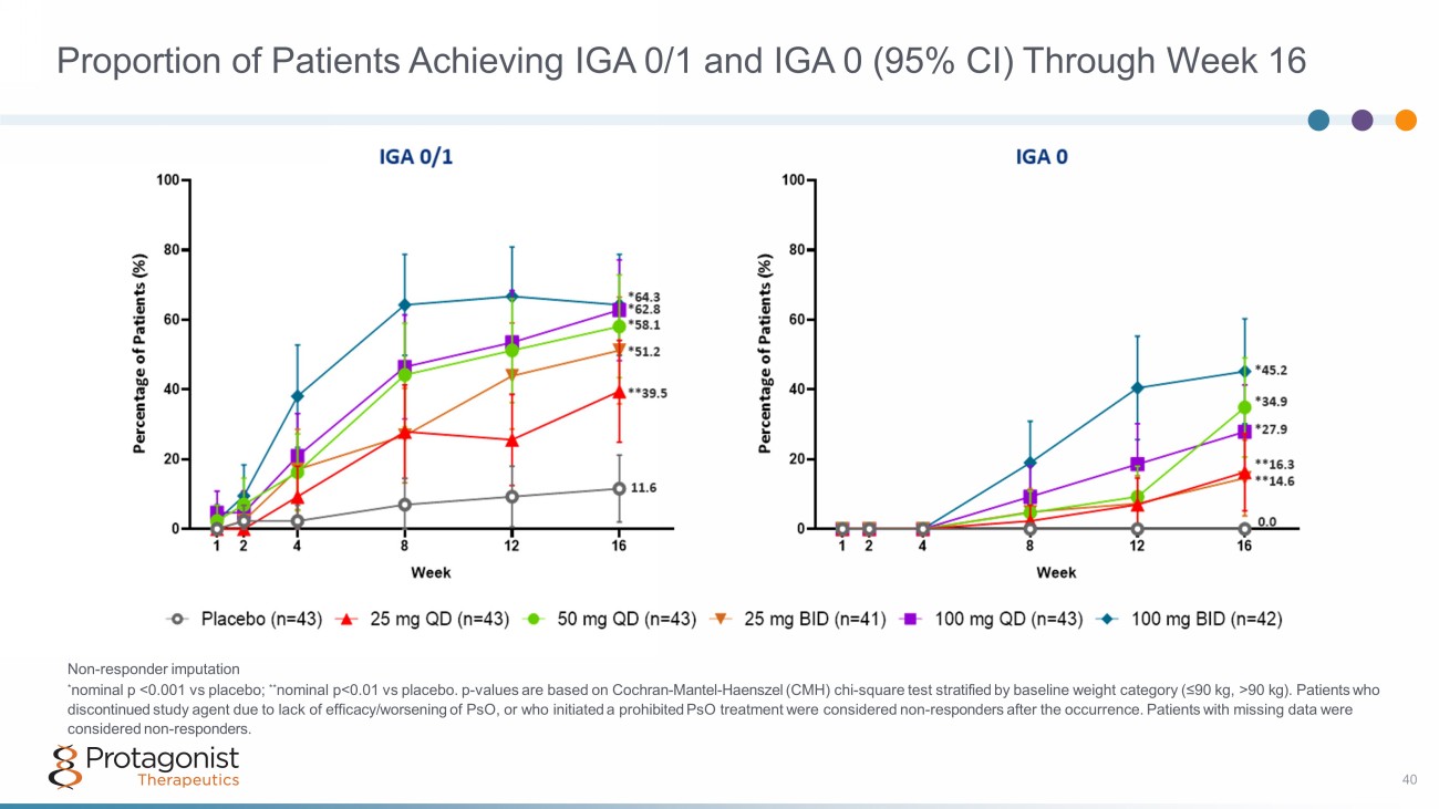 Proportion of Patients Achieving IGA 0/1 and IGA 0 (95% CI) Through Week 16 40 Non - responder imputation * nominal p <0.001 vs placebo; ** nominal p<0.01 vs placebo. p - values are based on Cochran - Mantel - Haenszel (CMH) chi - square test stratified by baseline weight category (≤90 kg, >90 kg). Patients who discontinued study agent due to lack of efficacy/worsening of PsO, or who initiated a prohibited PsO treatment were considered non - responders after the occurrence. Patients with missing data were considered non - responders.