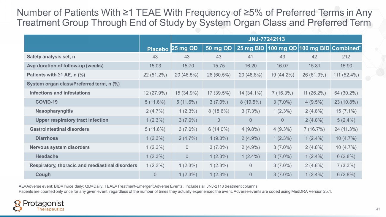 Number of Patients With ≥1 TEAE With Frequency of ≥5% of Preferred Terms in Any Treatment Group Through End of Study by System Organ Class and Preferred Term AE=Adverse event; BID=Twice daily; QD=Daily; TEAE=Treatment - Emergent Adverse Events. * Includes all JNJ - 2113 treatment columns. Patients are counted only once for any given event, regardless of the number of times they actually experienced the event. Adverse events are coded using MedDRA Version 25.1. Placebo JNJ - 77242113 25 mg QD 50 mg QD 25 mg BID 100 mg QD 100 mg BID Combined * Safety analysis set, n 43 43 43 41 43 42 212 Avg duration of follow - up (weeks) 15.03 15.70 15.75 16.20 16.07 15.81 15.90 Patients with ≥1 AE, n (%) 22 (51.2%) 20 (46.5%) 26 (60.5%) 20 (48.8%) 19 (44.2%) 26 (61.9%) 111 (52.4%) System organ class/Preferred term, n (%) Infections and infestations 12 (27.9%) 15 (34.9%) 17 (39.5%) 14 (34.1%) 7 (16.3%) 11 (26.2%) 64 (30.2%) COVID - 19 5 (11.6%) 5 (11.6%) 3 (7.0%) 8 (19.5%) 3 (7.0%) 4 (9.5%) 23 (10.8%) Nasopharyngitis 2 (4.7%) 1 (2.3%) 8 (18.6%) 3 (7.3%) 1 (2.3%) 2 (4.8%) 15 (7.1%) Upper respiratory tract infection 1 (2.3%) 3 (7.0%) 0 0 0 2 (4.8%) 5 (2.4%) Gastrointestinal disorders 5 (11.6%) 3 (7.0%) 6 (14.0%) 4 (9.8%) 4 (9.3%) 7 (16.7%) 24 (11.3%) Diarrhoea 1 (2.3%) 2 (4.7%) 4 (9.3%) 2 (4.9%) 1 (2.3%) 1 (2.4%) 10 (4.7%) Nervous system disorders 1 (2.3%) 0 3 (7.0%) 2 (4.9%) 3 (7.0%) 2 (4.8%) 10 (4.7%) Headache 1 (2.3%) 0 1 (2.3%) 1 (2.4%) 3 (7.0%) 1 (2.4%) 6 (2.8%) Respiratory, thoracic and mediastinal disorders 1 (2.3%) 1 (2.3%) 1 (2.3%) 0 3 (7.0%) 2 (4.8%) 7 (3.3%) Cough 0 1 (2.3%) 1 (2.3%) 0 3 (7.0%) 1 (2.4%) 6 (2.8%) 41